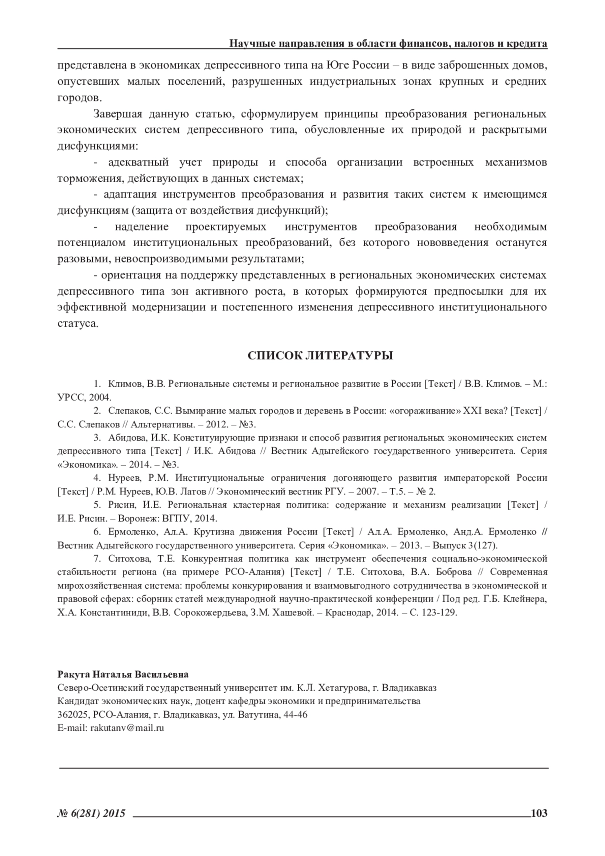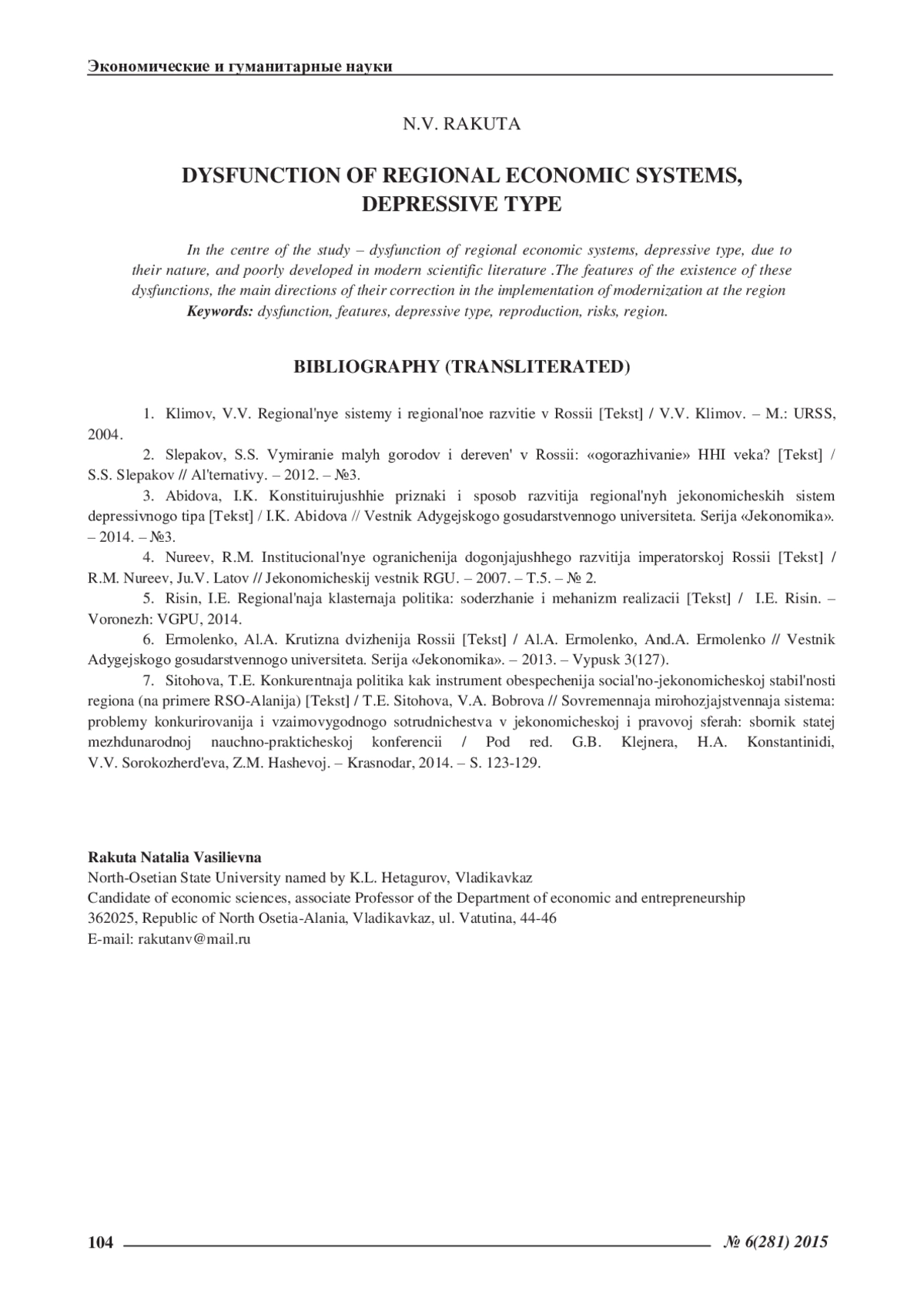 РАКУТА Н. В. ДИСФУНКЦИИ РЕГИОНАЛЬНЫХ ЭКОНОМИЧЕСКИХ СИСТЕМ ДЕПРЕССИВНОГО ТИПА // ЭКОНОМИЧЕСКИЕ И ГУМАНИТАРНЫЕ НАУКИ. 2015. № 6 (281)