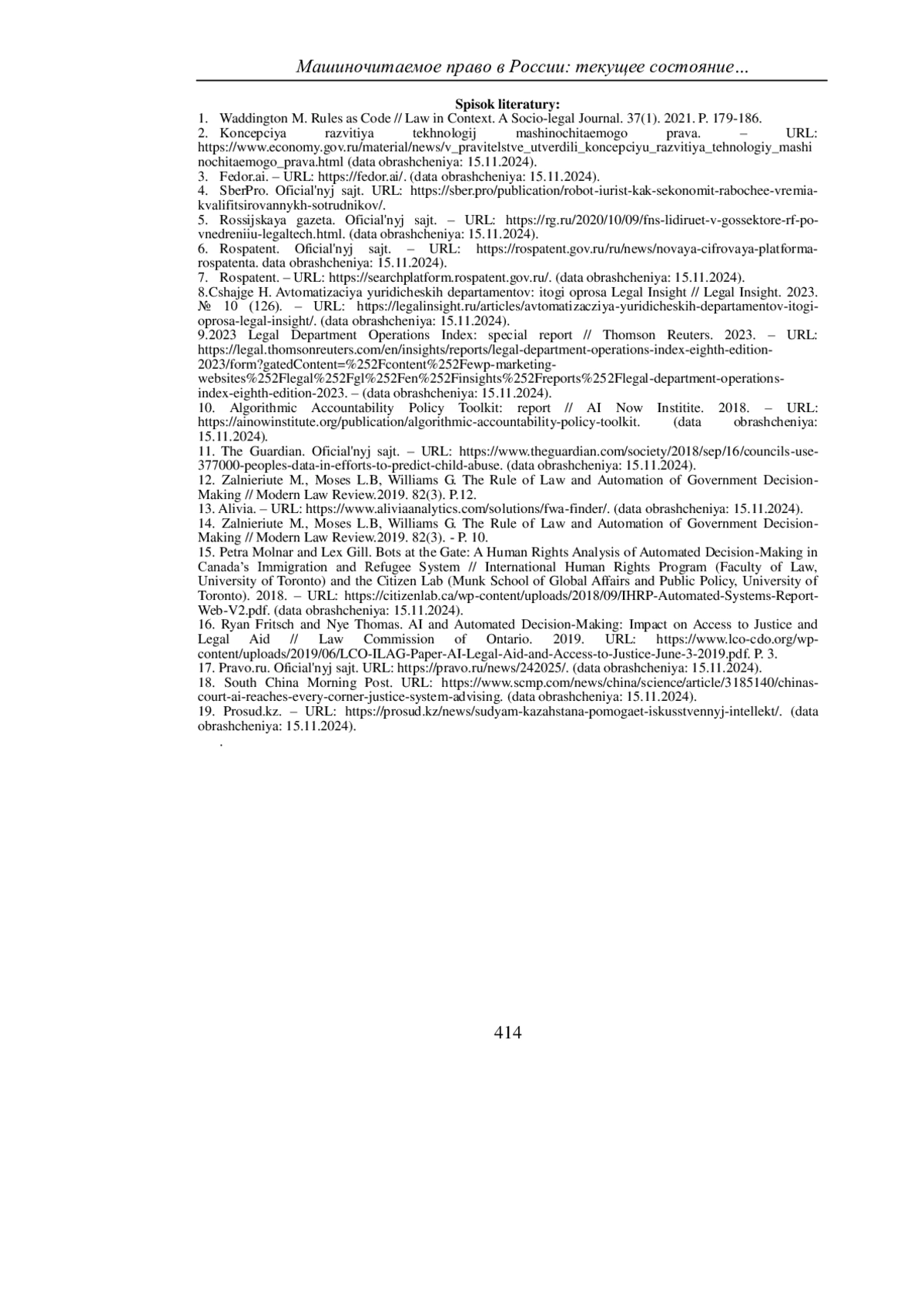 Ключевые фразы: алгоритм, алгоритмизация права, МАШИНОЧИТАЕМОЕ ПРАВО, цифровизация правосудия, умный суд, предиктивная полицейская деятельность, алгоритмизированные системы принятия решений