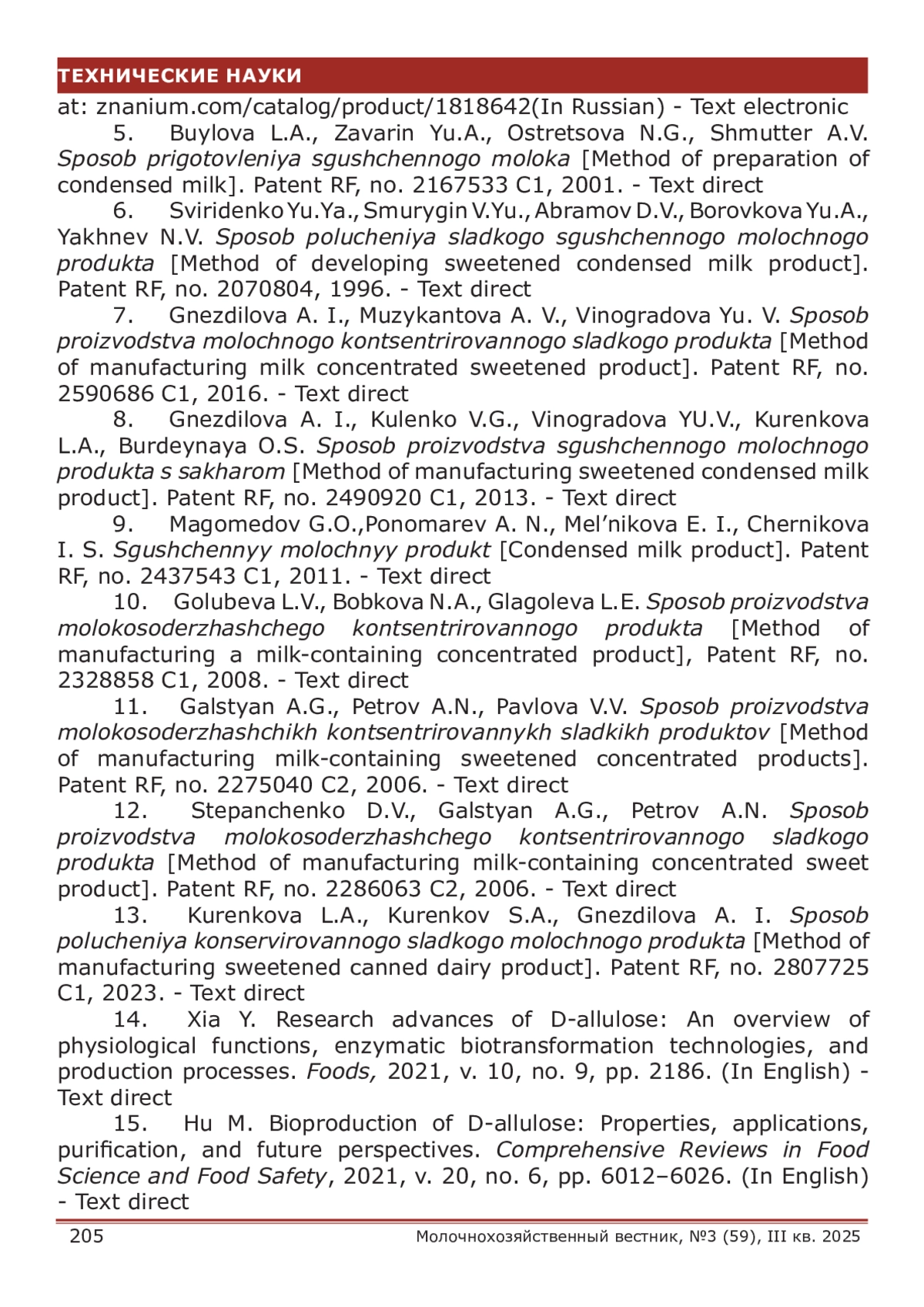 13. Пат. 2807725 С1, МПК A23C 9/152 (2006.01) Способ получения консервированного сладкого молочного продукта / Л.А. Куренкова, С.А. Куренков, А.И. Гнездилова; заявитель и патентообладатель Федеральное государственное бюджетное образовательное учреждение высшего образования “Вологодская государственная молочнохозяйственная академия имени Н.В. Верещагина”. - № 2023109259, 2023.04.12 заявл 2023.04.12 опубл. 2023.11.21.