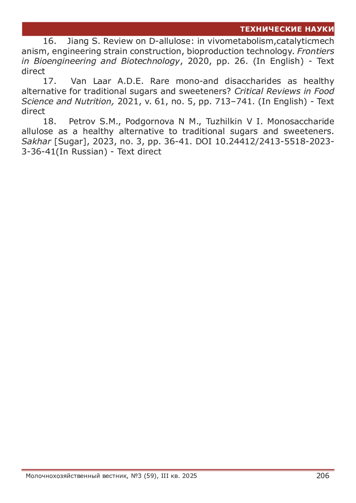 18. Петров, С.М. Моносахарид аллюлоза как здоровая альтернатива традиционным сахарам и подсластителям / С.М. Петров, Н.М. Подгорнова, В.И. Тужилкин // Сахар. - 2023. - № 3 - C. 36-41. -.
