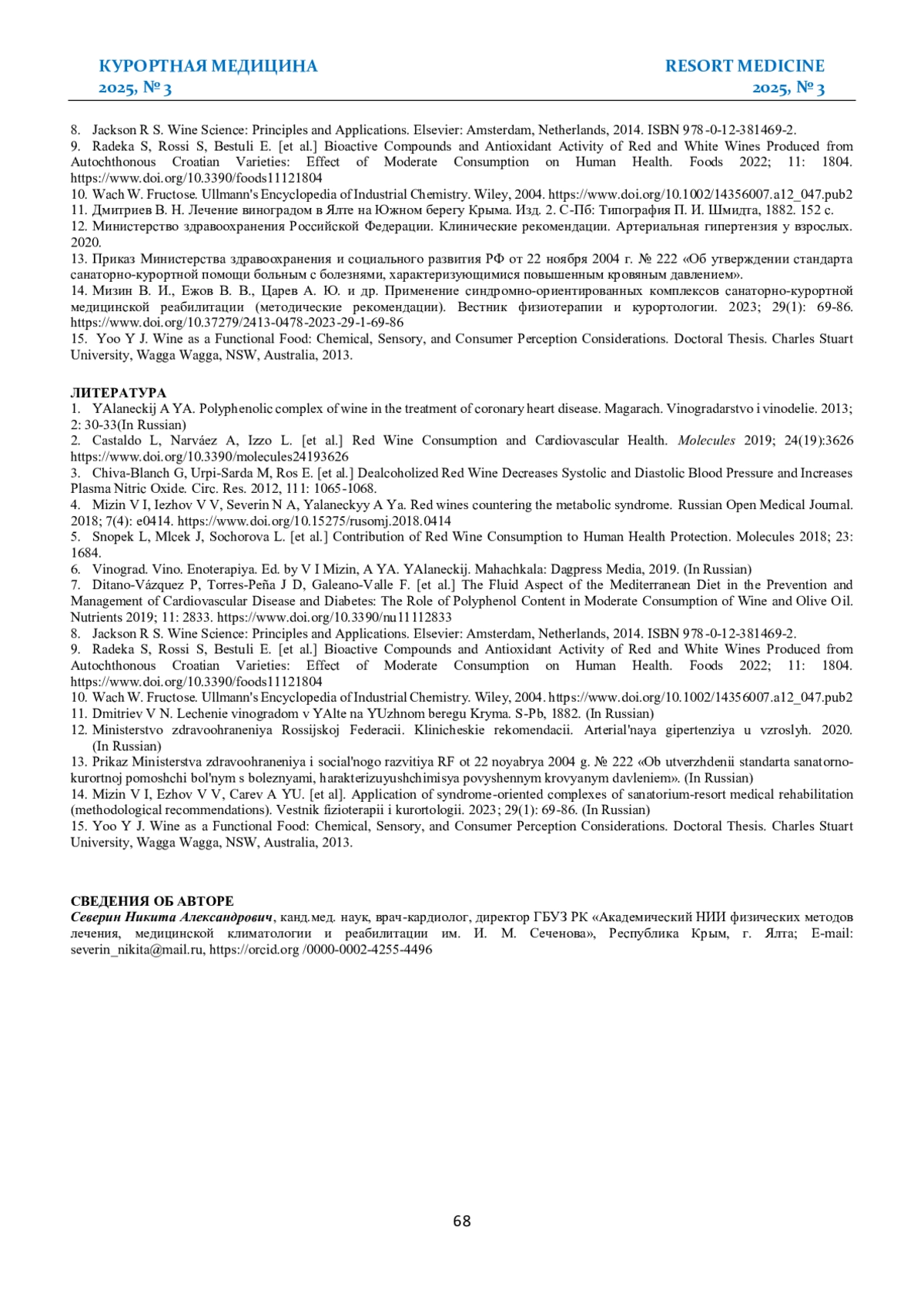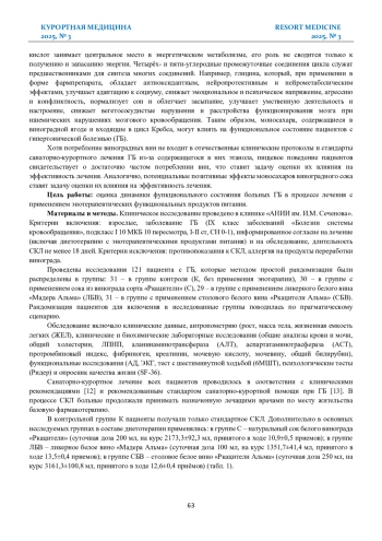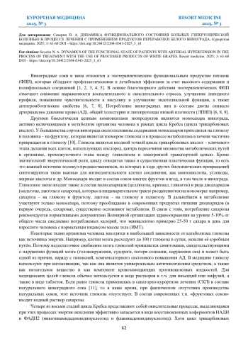 СЕВЕРИН Н. А. ДИНАМИКА ФУНКЦИОНАЛЬНОГО СОСТОЯНИЯ БОЛЬНЫХ ГИПЕРТОНИЧЕСКОЙ БОЛЕЗНЬЮ В ПРОЦЕССЕ ЛЕЧЕНИЯ С ПРИМЕНЕНИЕМ ПРОДУКТОВ ПЕРЕРАБОТКИ БЕЛОГО ВИНОГРАДА // КУРОРТНАЯ МЕДИЦИНА. 2025. № 3