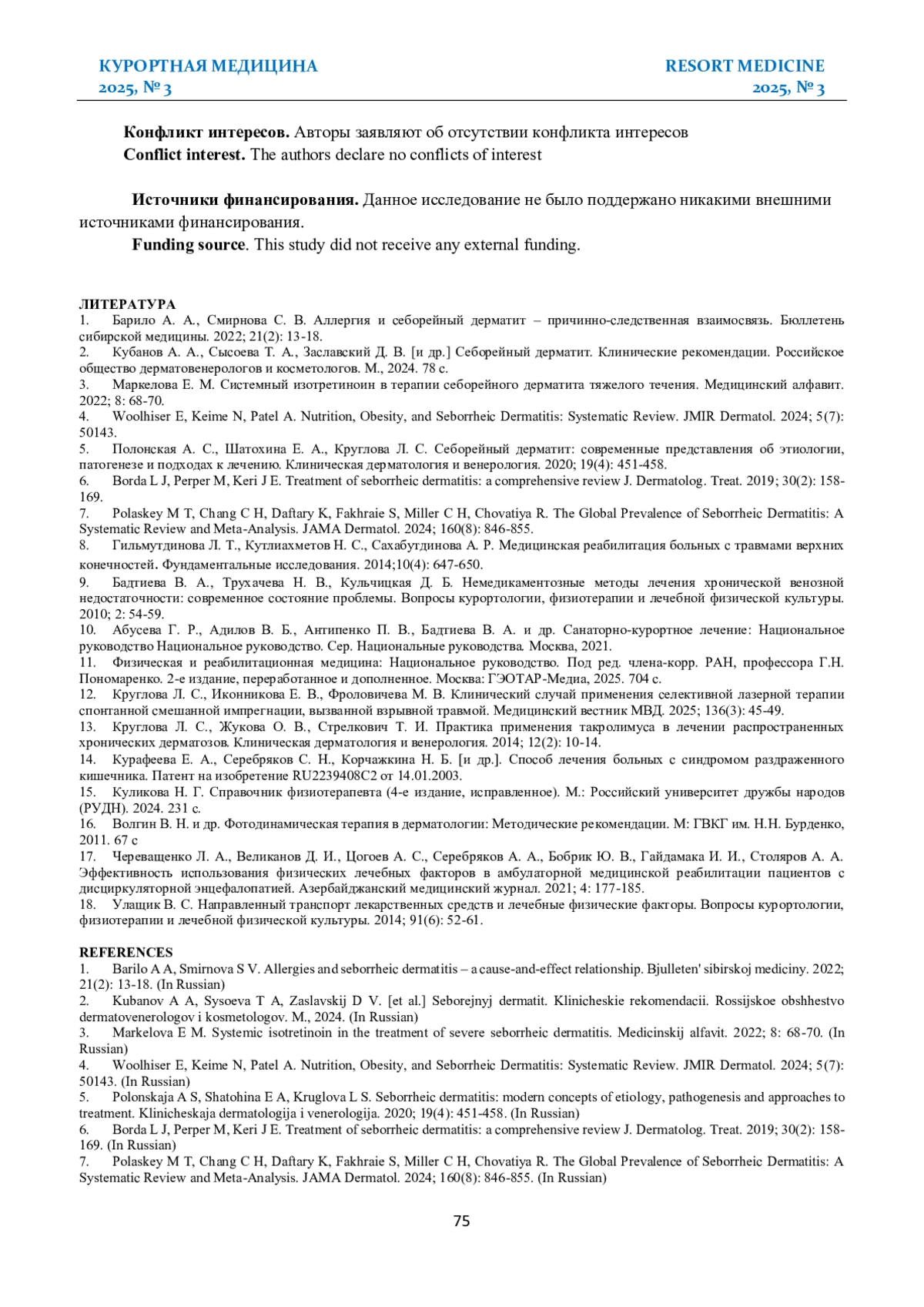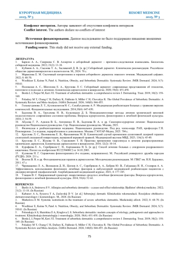 2. Кубанов А. А., Сысоева Т. А., Заславский Д. В. [и др.] Себорейный дерматит. Клинические рекомендации. Российское общество дерматовенерологов и косметологов. М., 2024. 78 с.