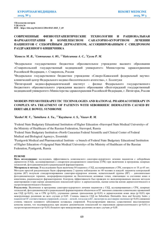 Цель исследования: исследовать эффективность комплексного санаторно-курортного лечения пациентов с себорейным дерматитом (СбД), ассоциированным с синдромом раздраженного кишечника (СРК) при включении в программы лазерных технологий, фотодинамической и рациональной фармакотерапии.