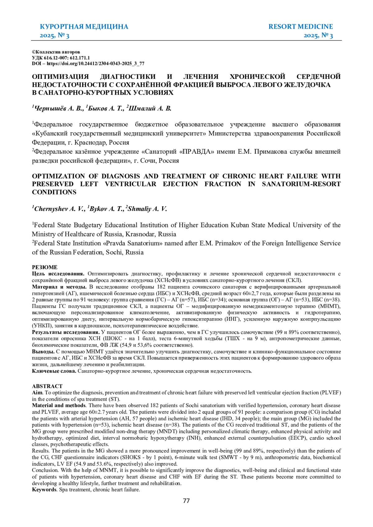Цель исследования. Оптимизировать диагностику, профилактику и лечение хронической сердечной недостаточности с сохранённой фракцией выброса левого желудочка (ХСНсФВ) в условиях санаторно-курортного лечения (СКЛ).