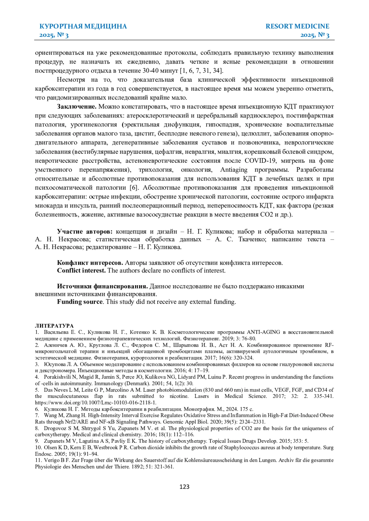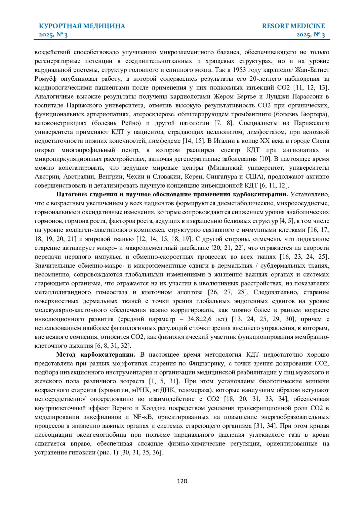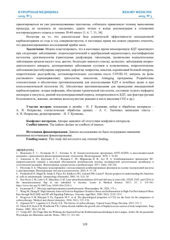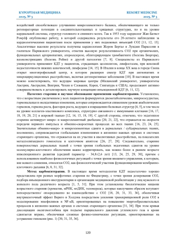 КУЛИКОВА Н. Г., НЕКРАСОВА А. Н. ИНЪЕКЦИОННАЯ КАРБИОКСИТЕРАПИЯ В АНТИВОЗРАСТНЫХ ПРОГРАММАХ // КУРОРТНАЯ МЕДИЦИНА. 2025. № 3