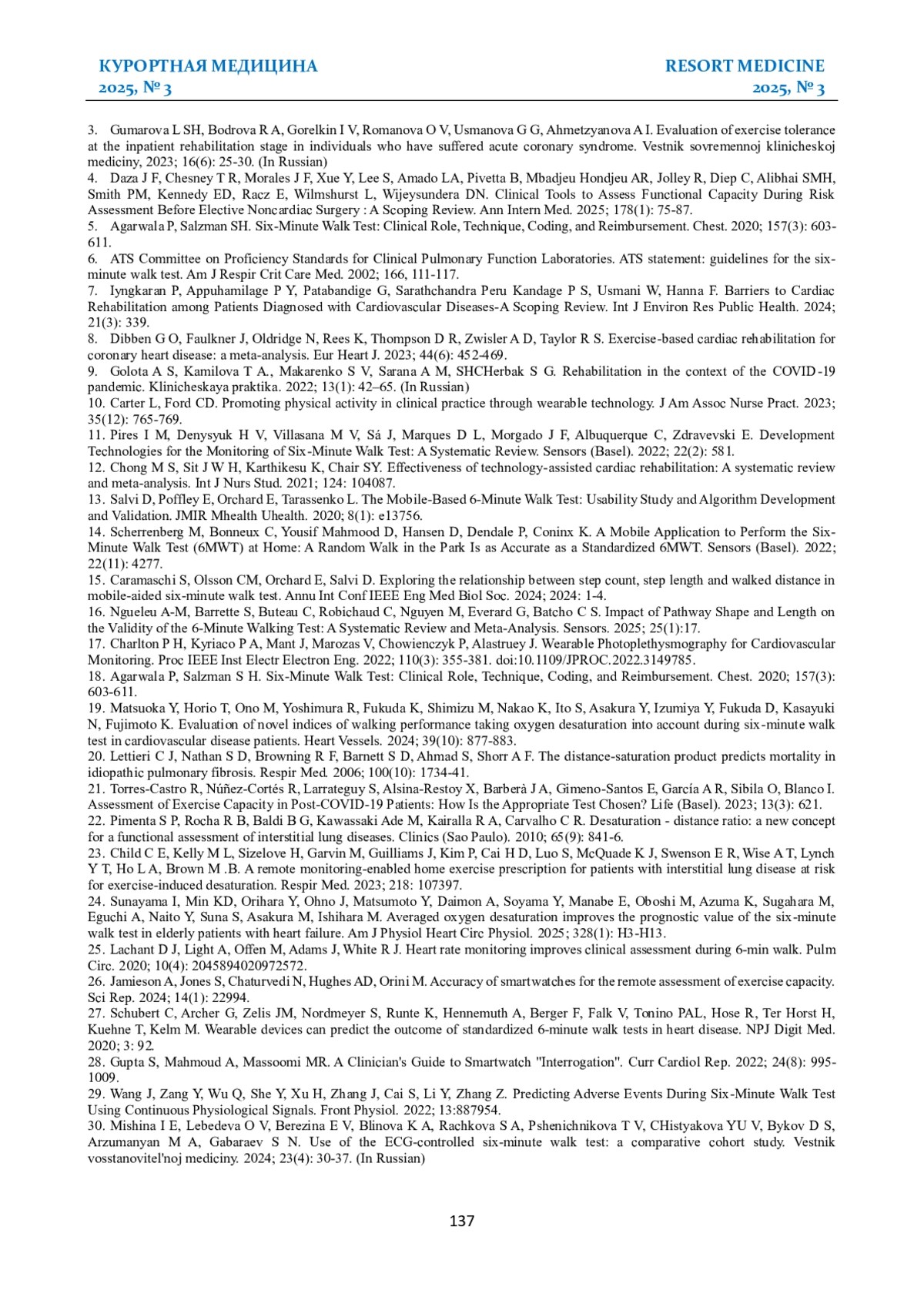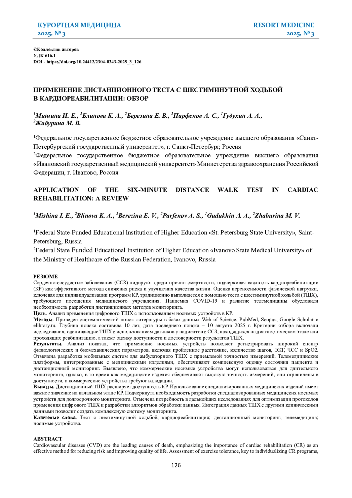 МИШИНА И. Е., БЛИНОВА К. А., БЕРЕЗИНА Е. В., ПАРФЕНОВ А. С., ГУДУХИН А. А., ЖАБУРИНА М. В. ПРИМЕНЕНИЕ ДИСТАНЦИОННОГО ТЕСТА С ШЕСТИМИНУТНОЙ ХОДЬБОЙ В КАРДИОРЕАБИЛИТАЦИИ: ОБЗОР // КУРОРТНАЯ МЕДИЦИНА. 2025. № 3