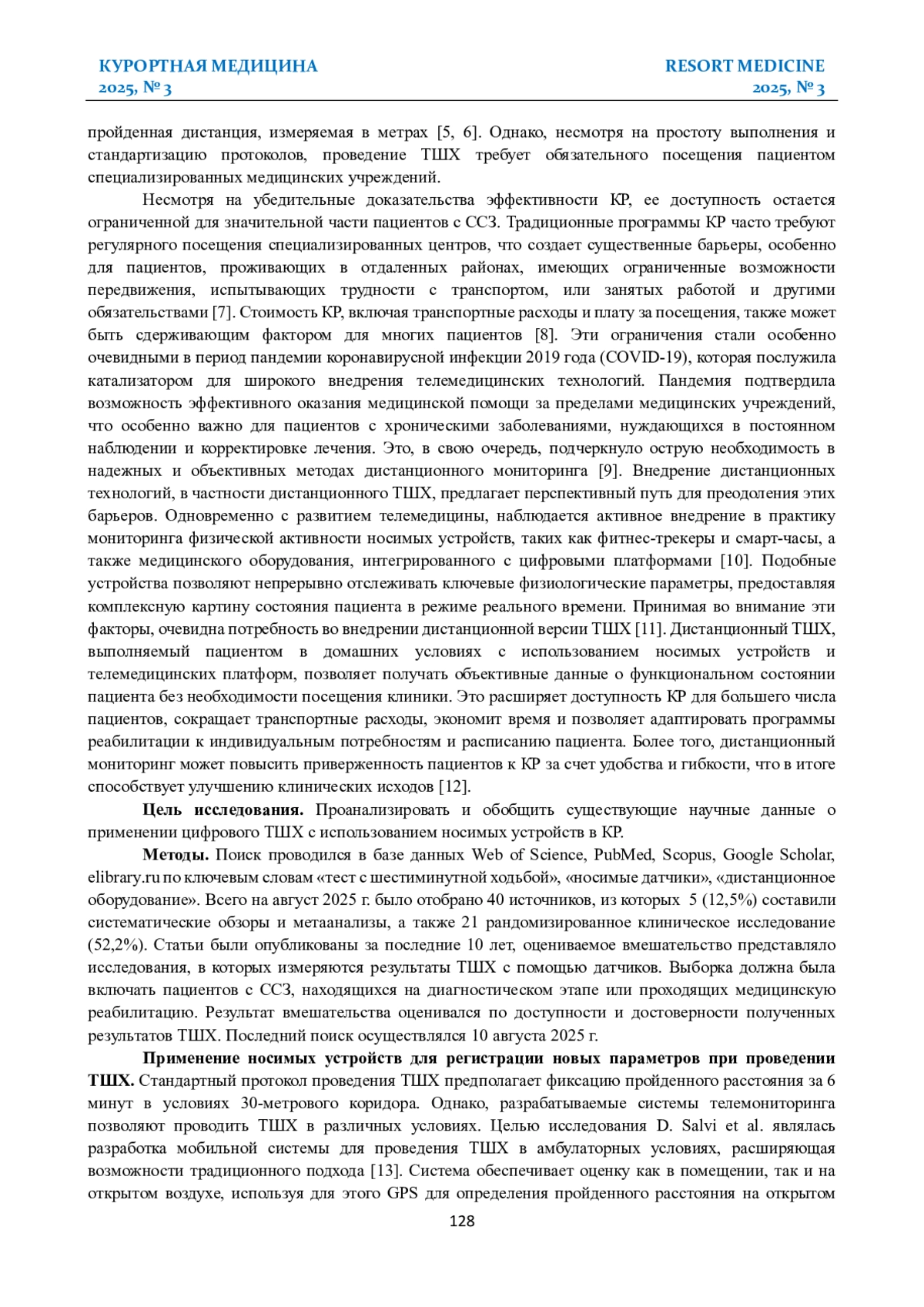 Статья: ПРИМЕНЕНИЕ ДИСТАНЦИОННОГО ТЕСТА С ШЕСТИМИНУТНОЙ ХОДЬБОЙ В КАРДИОРЕАБИЛИТАЦИИ: ОБЗОР (2025)