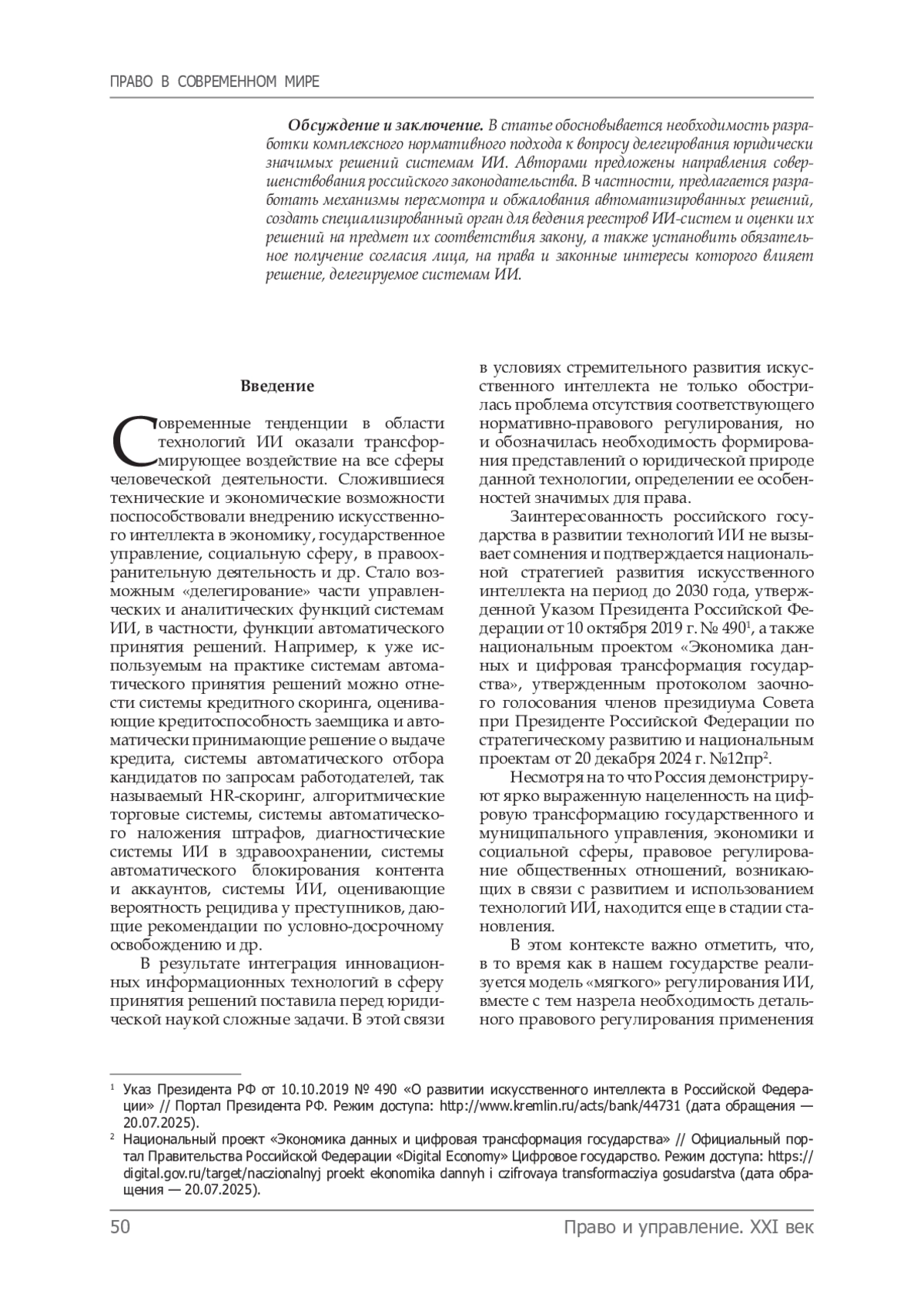 Обсуждение и заключение. В статье обосновывается необходимость разработки комплексного нормативного подхода к вопросу делегирования юридически значимых решений системам ИИ. Авторами предложены направления совершенствования российского законодательства. В частности, предлагается разработать механизмы пересмотра и обжалования автоматизированных решений, создать специализированный орган для ведения реестров ИИ-систем и оценки их решений на предмет их соответствия закону, а также установить обязательное получение согласия лица, на права и законные интересы которого влияет решение, делегируемое системам ИИ.