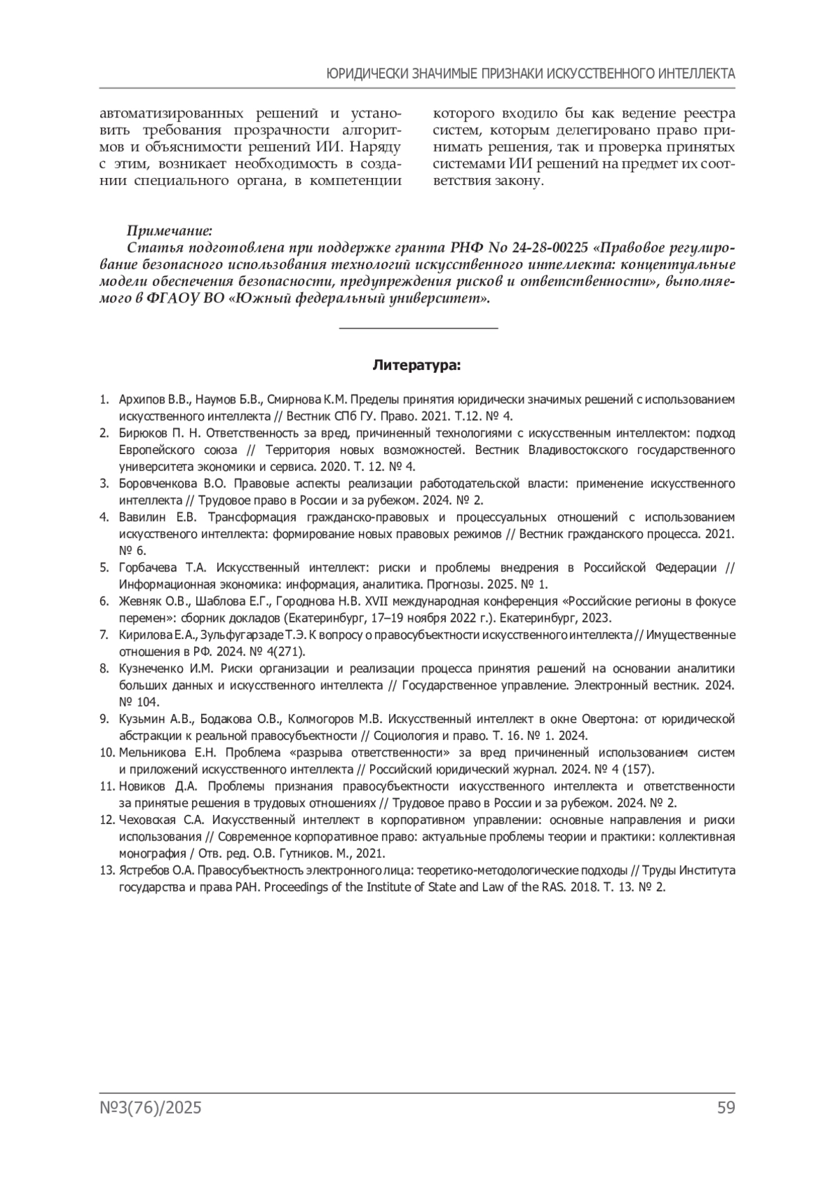11. Новиков Д.А. Проблемы признания правосубъектности искусственного интеллекта и ответственности за принятые решения в трудовых отношениях // Трудовое право в России и за рубежом. 2024. № 2.