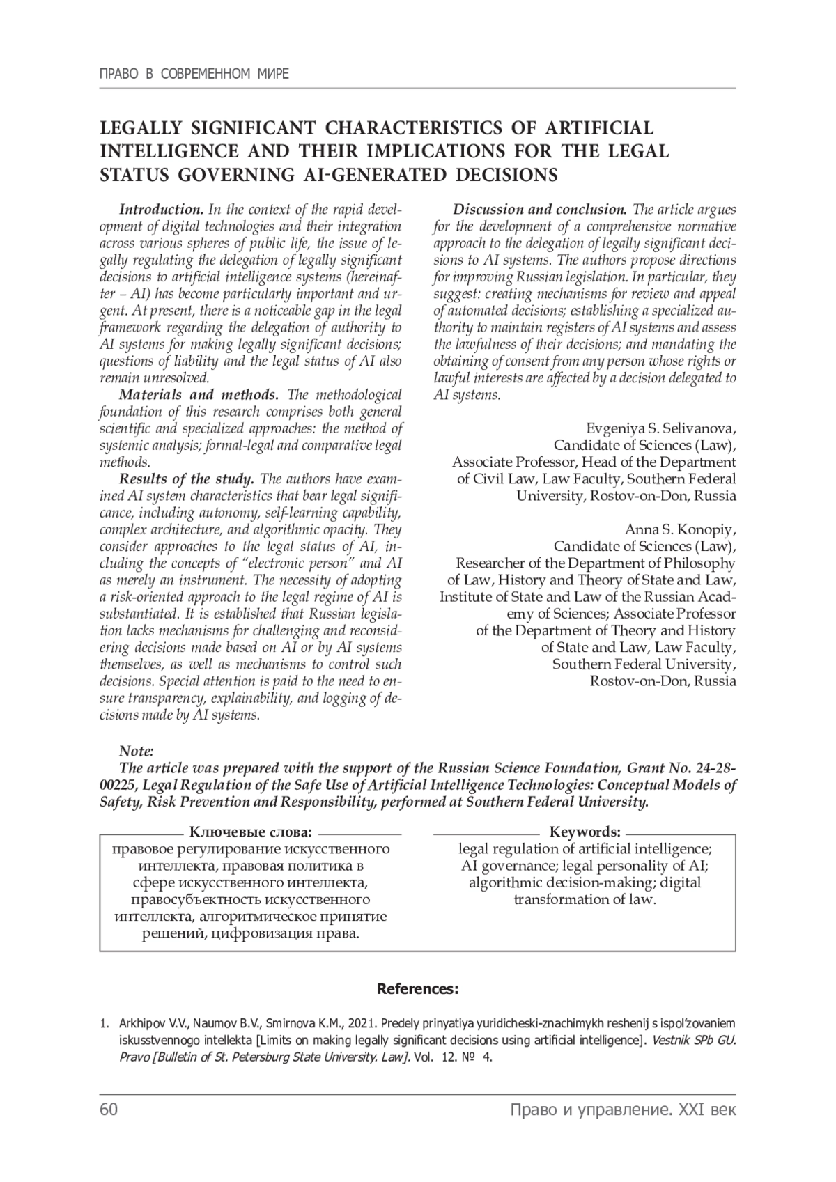 1. Архипов В.В., Наумов Б.В., Смирнова К.М. Пределы принятия юридически значимых решений с использованием искусственного интеллекта // Вестник СПб ГУ. Право. 2021. Т.12. № 4.