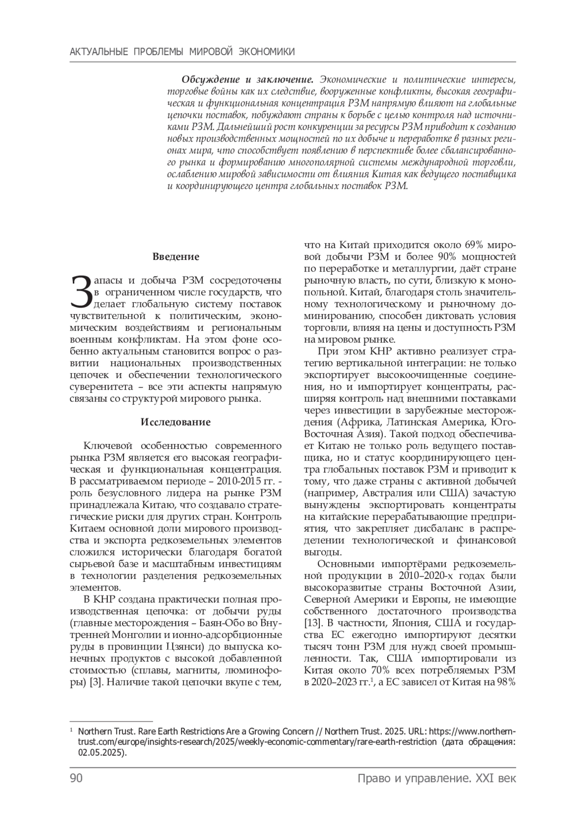 Обсуждение и заключение. Экономические и политические интересы, торговые войны как их следствие, вооруженные конфликты, высокая географическая и функциональная концентрация РЗМ напрямую влияют на глобальные цепочки поставок, побуждают страны к борьбе с целью контроля над источниками РЗМ. Дальнейший рост конкуренции за ресурсы РЗМ приводит к созданию новых производственных мощностей по их добыче и переработке в разных регионах мира, что способствует появлению в перспективе более сбалансированного рынка и формированию многополярной системы международной торговли, ослаблению мировой зависимости от влияния Китая как ведущего поставщика и координирующего центра глобальных поставок РЗМ.