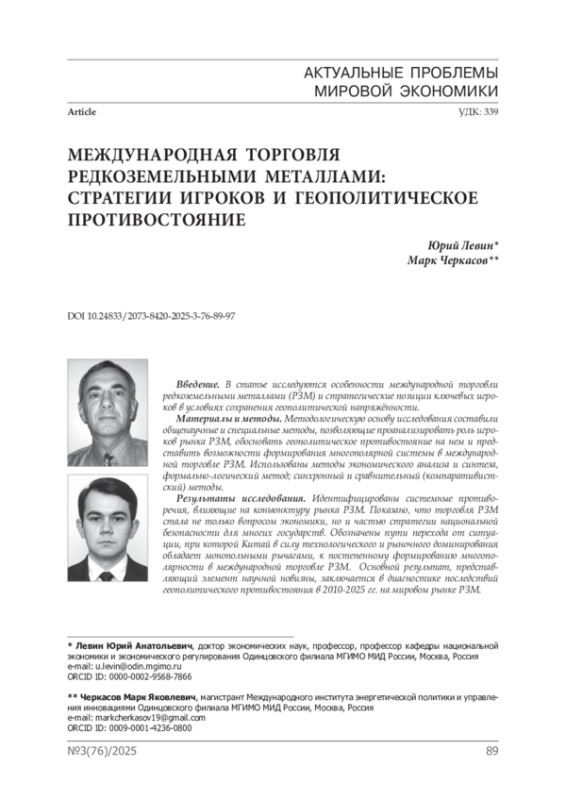 Введение. В статье исследуются особенности международной торговли редкоземельными металлами (РЗМ) и стратегические позиции ключевых игроков в условиях сохранения геополитической напряжённости.