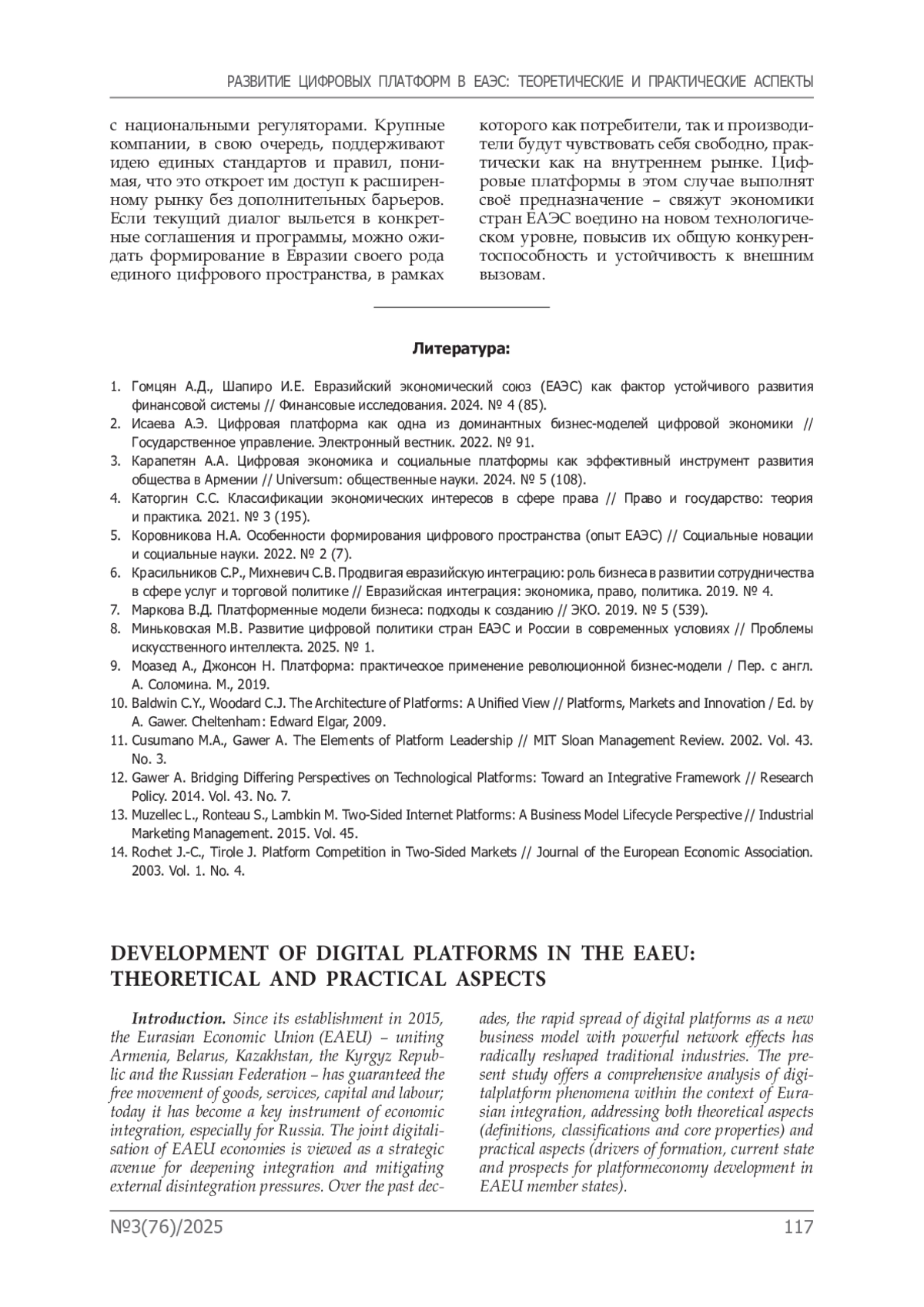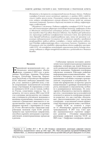 Статья: РАЗВИТИЕ ЦИФРОВЫХ ПЛАТФОРМ В ЕАЭС: ТЕОРЕТИЧЕСКИЕ И ПРАКТИЧЕСКИЕ АСПЕКТЫ (2025)