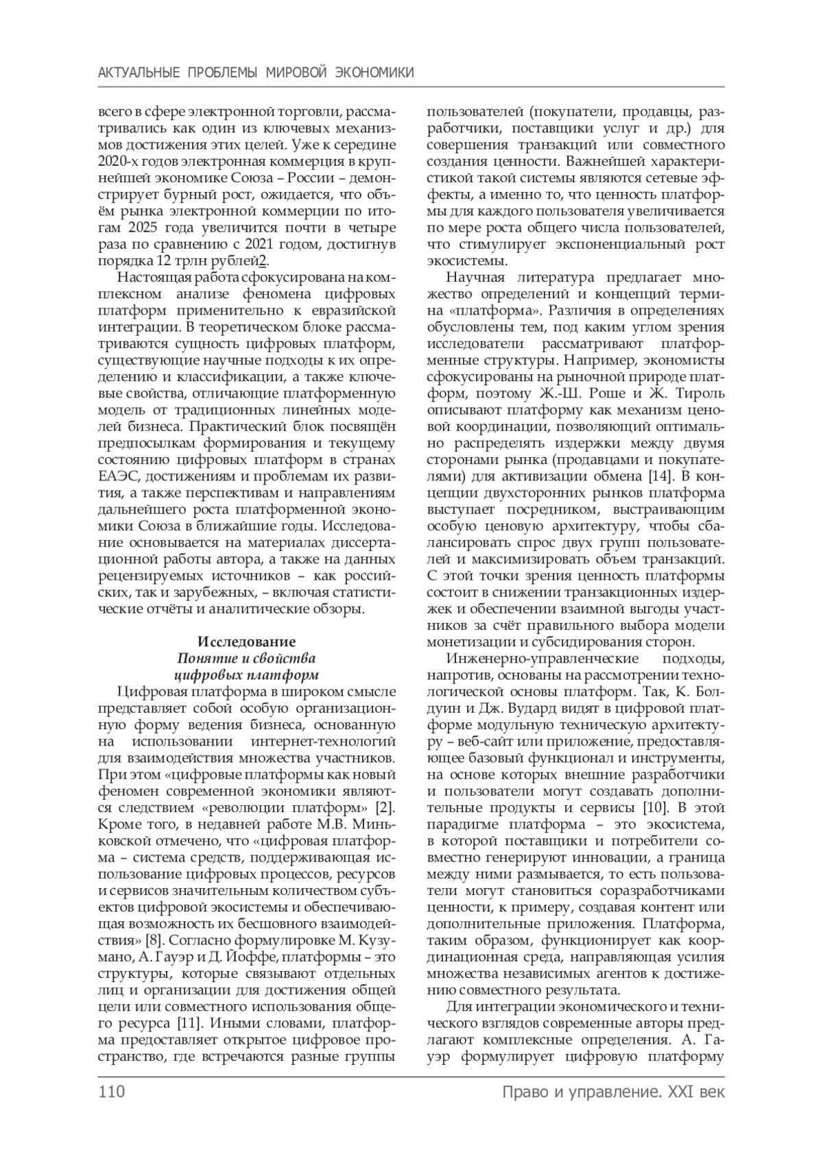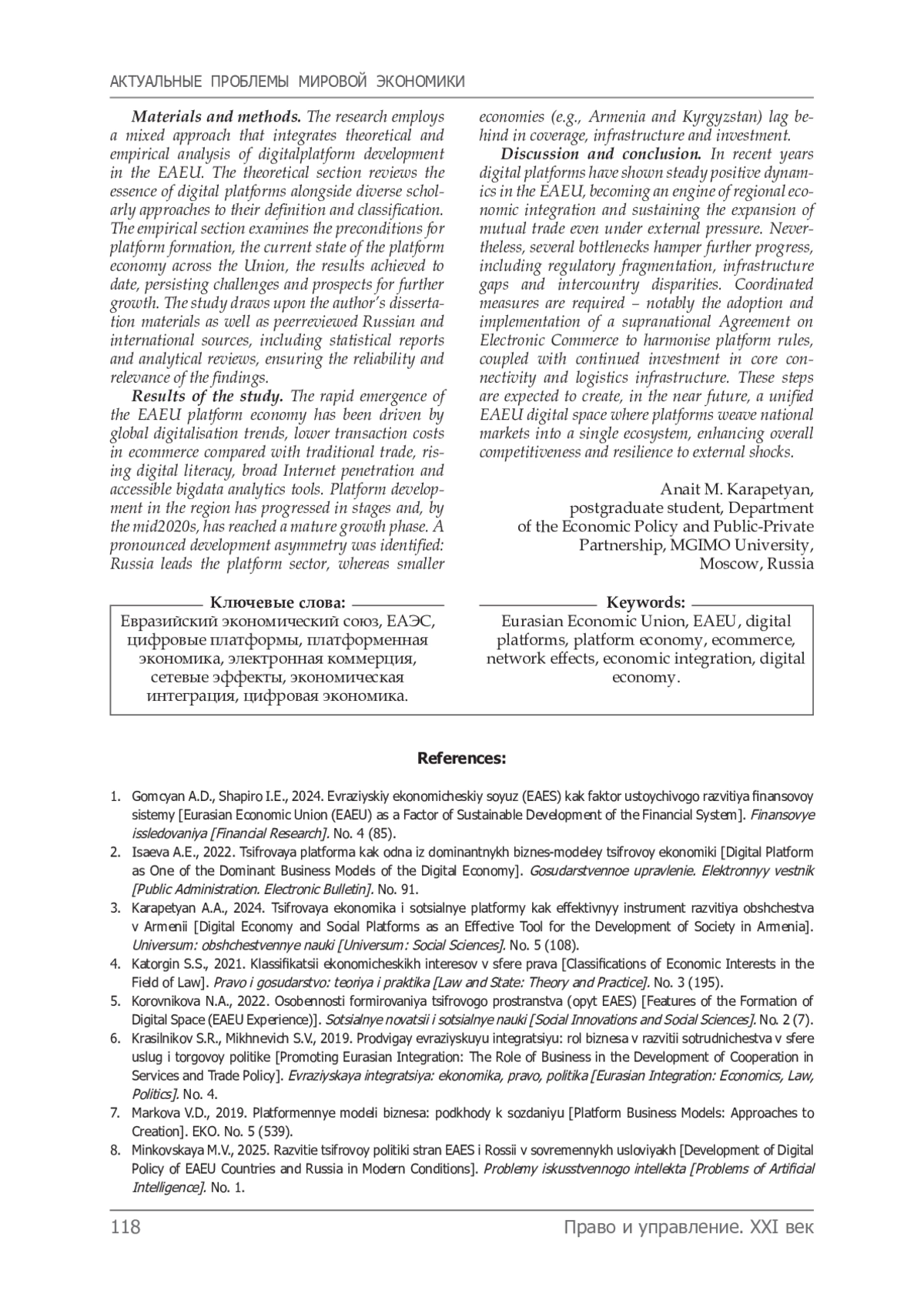 КАРАПЕТЯН А. М. РАЗВИТИЕ ЦИФРОВЫХ ПЛАТФОРМ В ЕАЭС: ТЕОРЕТИЧЕСКИЕ И ПРАКТИЧЕСКИЕ АСПЕКТЫ // ПРАВО И УПРАВЛЕНИЕ. XXI ВЕК. 2025. ТОМ 21, № 3