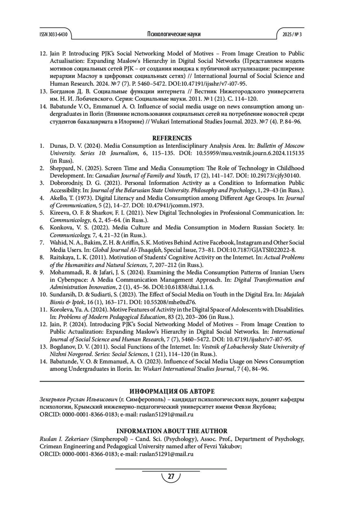 12. Jain P. Introducing PJK’s Social Networking Model of Motives - From Image Creation to Public Actualisation: Expanding Maslow’s Hierarchy in Digital Social Networks (Представляем модель мотивов социальных сетей PJK - от создания имиджа к публичной актуализации: расширение иерархии Маслоу в цифровых социальных сетях) // International Journal of Social Science and Human Research. 2024. № 7 (7). P. 5460-5472. https://doi.org/10.47191/ijsshr/v7-i07-95.