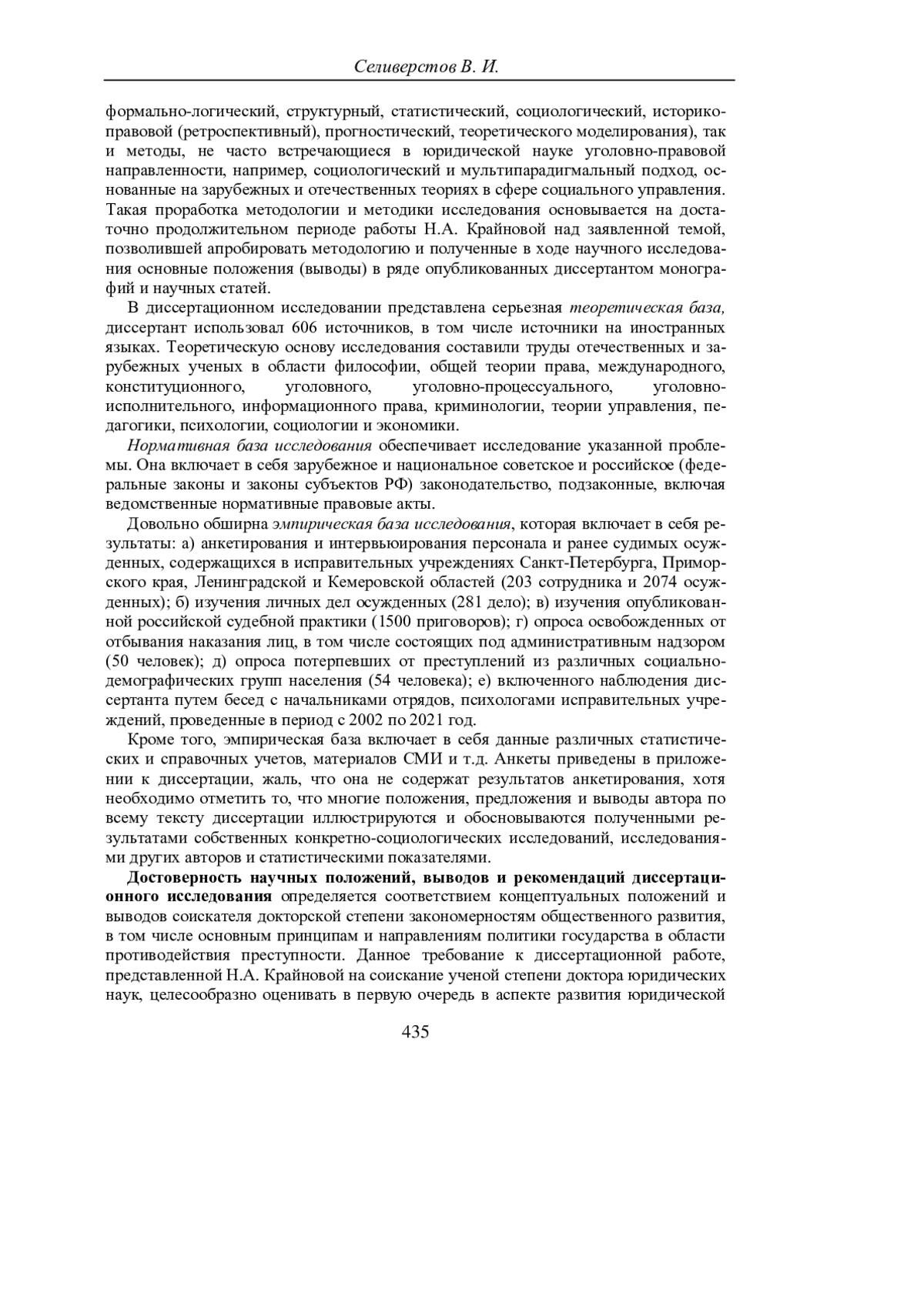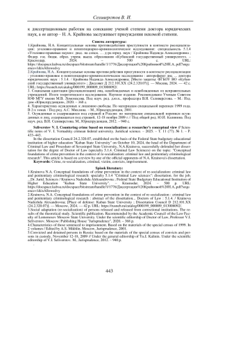 2. Крайнова, Н.А. Концептуальные основы противодействия преступности в контексте ресоциализации: уголовно-правовое и пенитенциарно-криминологическое исследование: автореферат дис.. доктора юридических наук: 5.1.4. / Крайнова Надежда Александровна; [Место защиты: ФГБОУ ВО “Кубанский государственный университет”; Диссовет Д 212.101.XX (24.2.320.07)]. - Москва, 2024. - 42 с. URL: https://rusneb.ru/catalog/000199_000009_013008092/.