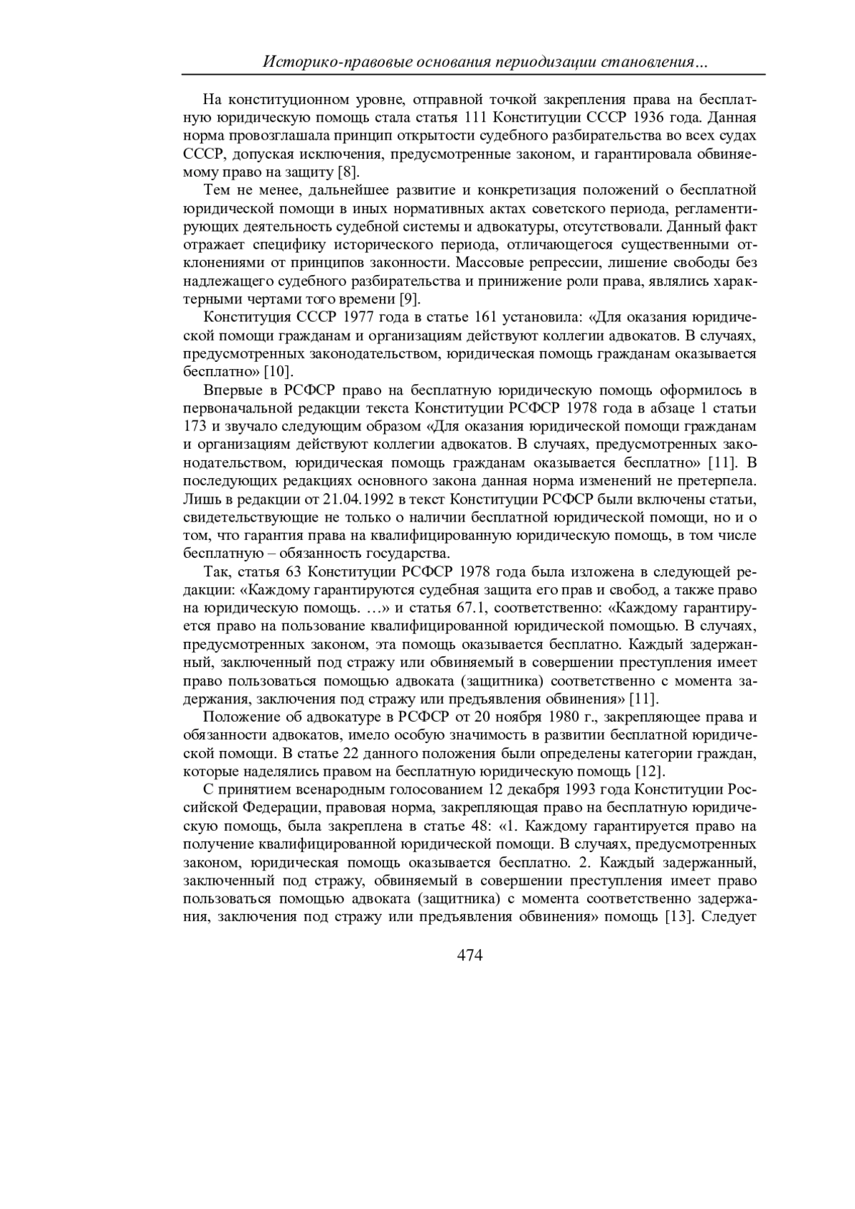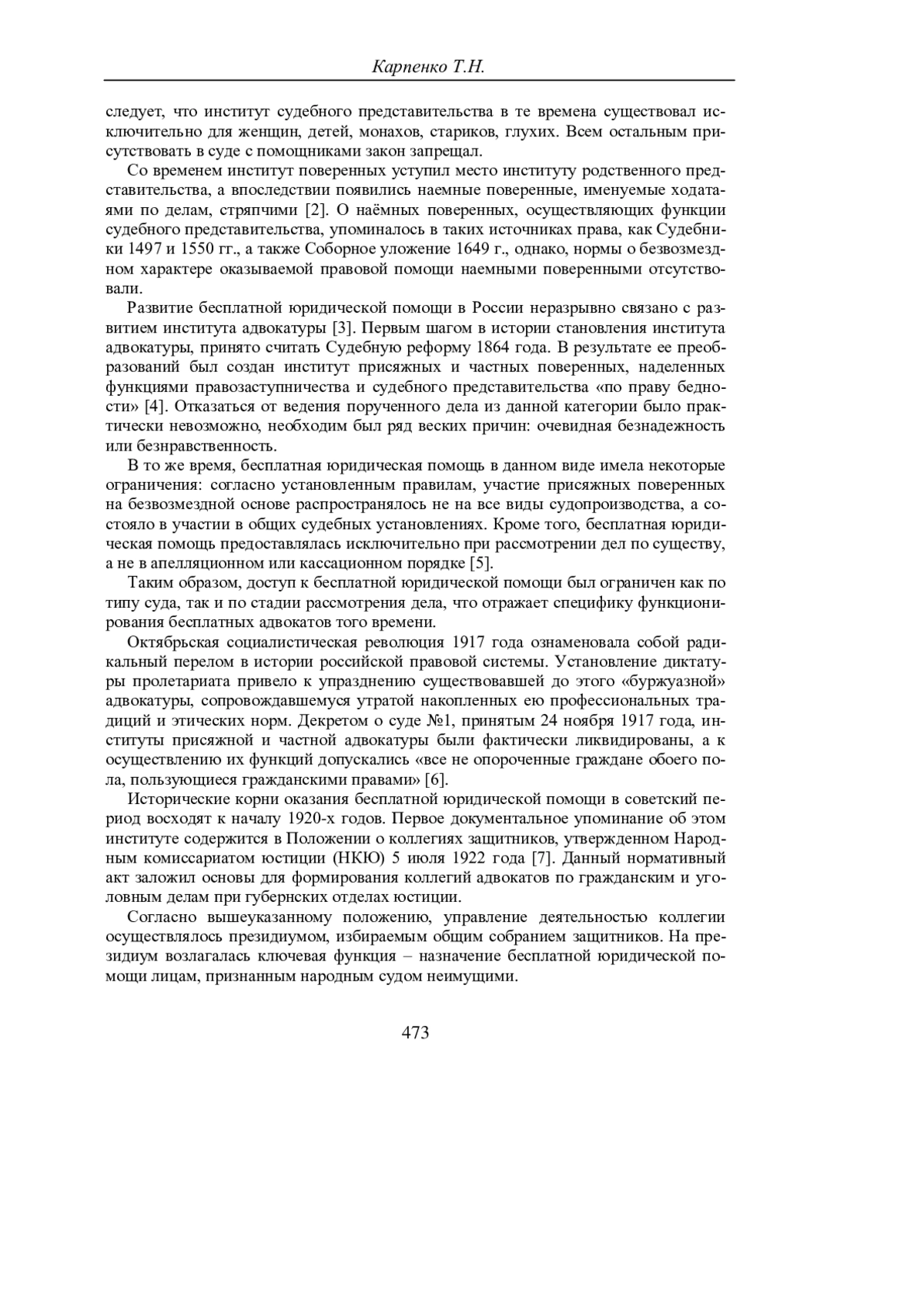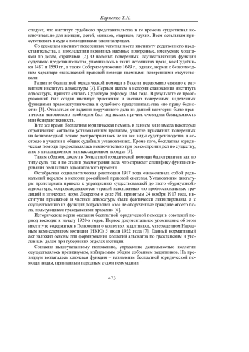 16. Крамской В.В., Зацепина М.Ю. Развитие института бесплатной юридической помощи в России в советские годы и его трансформация в современное состояние // Молодой ученый. 2020. № 19 (309). С. 320-322. EDN: TSXRJR