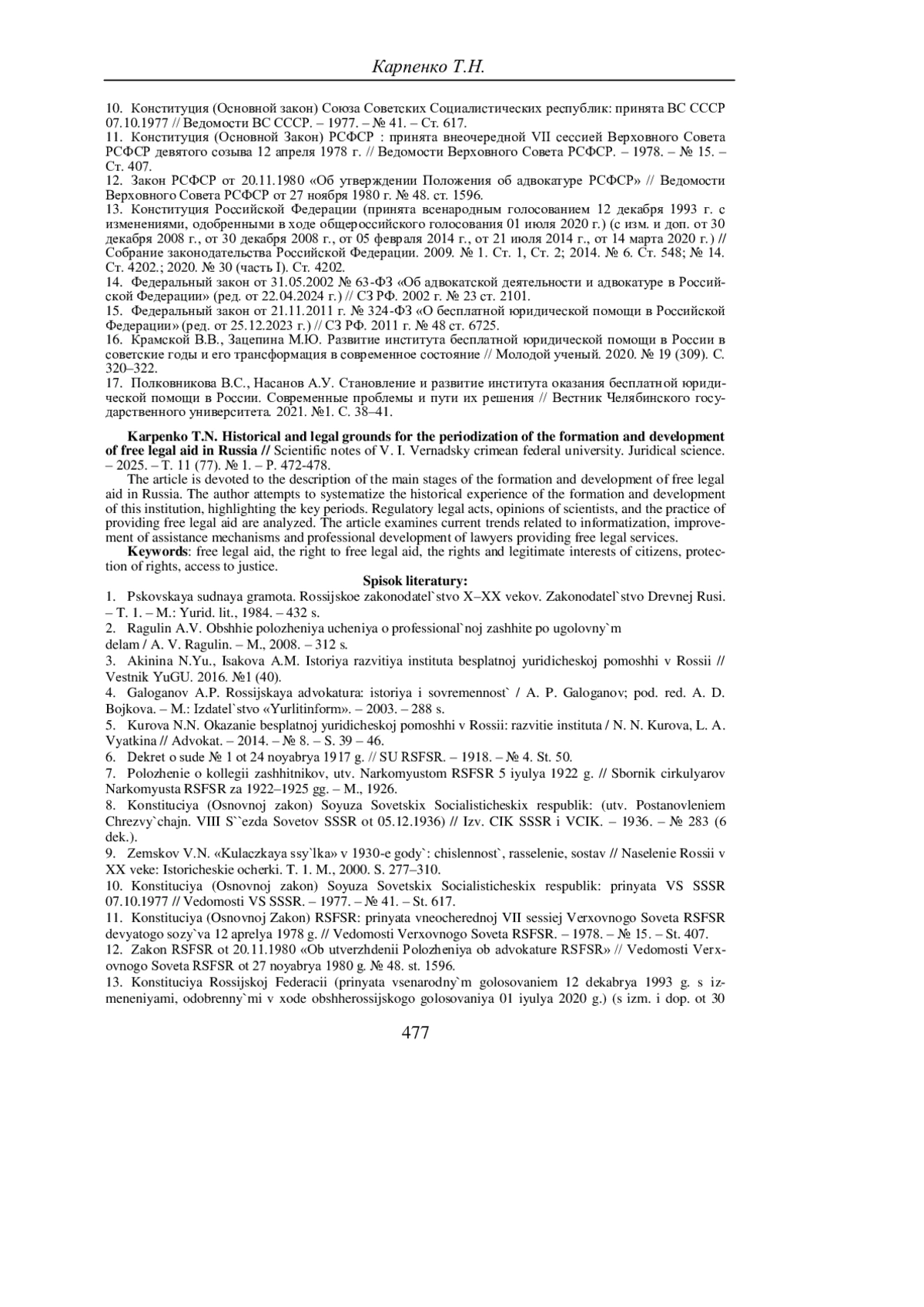 17. Полковникова В.С., Насанов А.У. Становление и развитие института оказания бесплатной юридической помощи в России. Современные проблемы и пути их решения // Вестник Челябинского государственного университета. 2021. №1. С. 38-41.