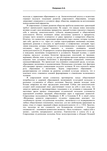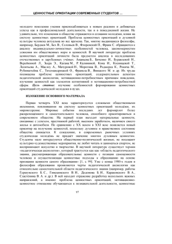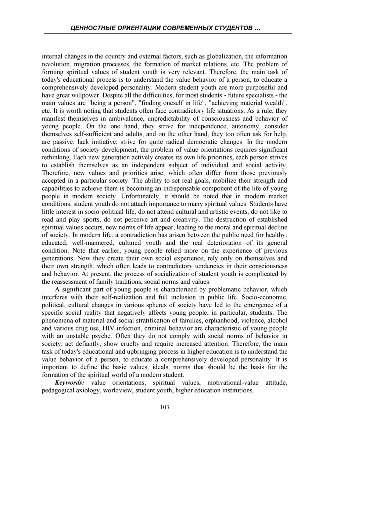 Ключевые фразы: ЦЕННОСТНЫЕ ОРИЕНТАЦИИ, духовные ценности, мотивационно-ценностное отношение, педагогическая аксиология, мировоззрение, СТУДЕНЧЕСКАЯ МОЛОДЕЖЬ, высшие учебные заведения