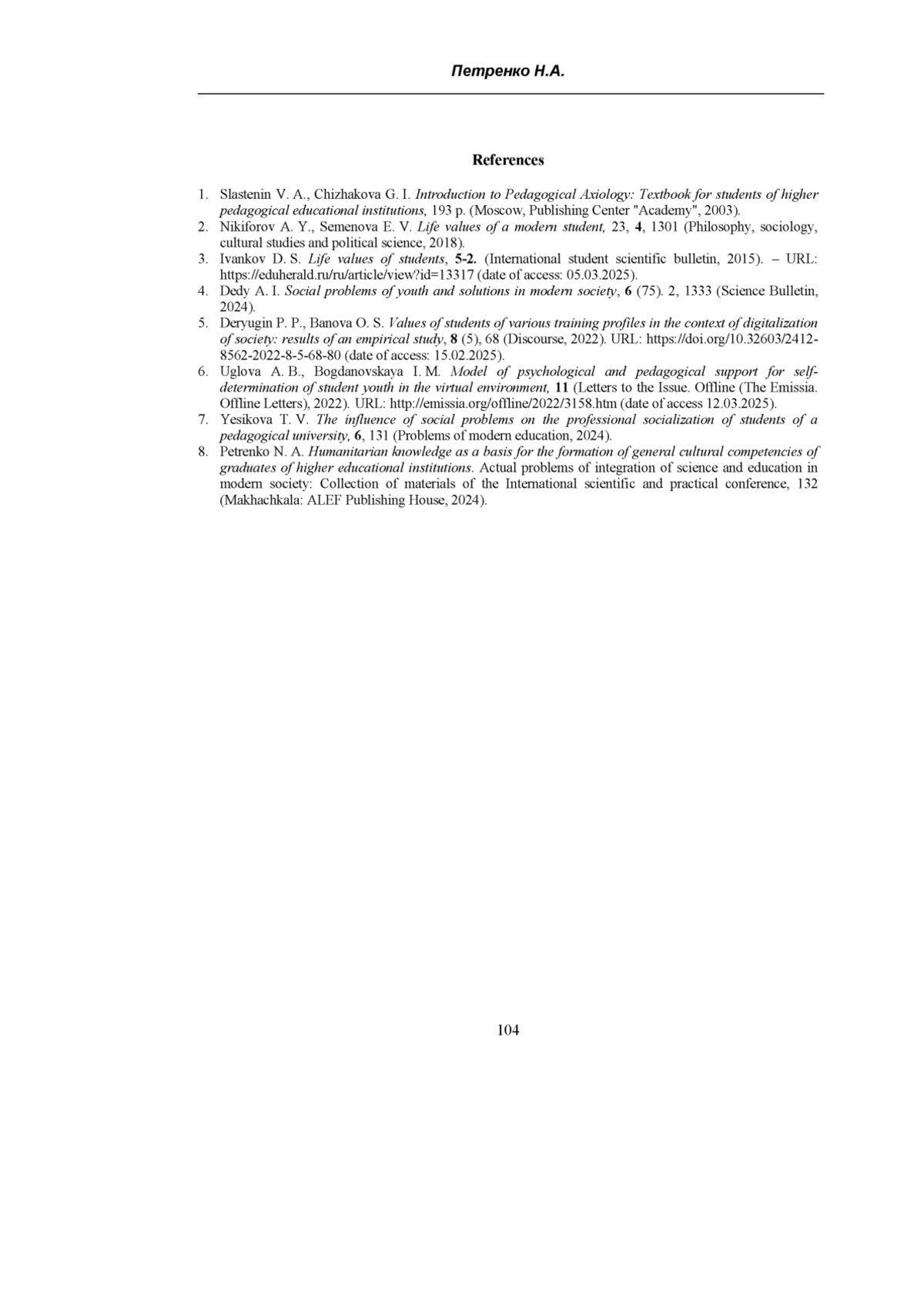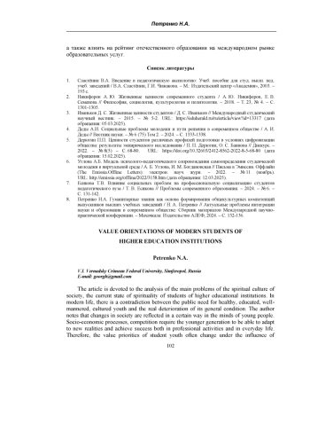 ПЕТРЕНКО Н. А. ЦЕННОСТНЫЕ ОРИЕНТАЦИИ СОВРЕМЕННЫХ СТУДЕНТОВ ВЫСШИХ УЧЕБНЫХ ЗАВЕДЕНИЙ // УЧЕНЫЕ ЗАПИСКИ КРЫМСКОГО ФЕДЕРАЛЬНОГО УНИВЕРСИТЕТА ИМЕНИ В. И. ВЕРНАДСКОГО. СОЦИОЛОГИЯ. ПЕДАГОГИКА. ПСИХОЛОГИЯ. 2025. ТОМ 11 (77). № 2