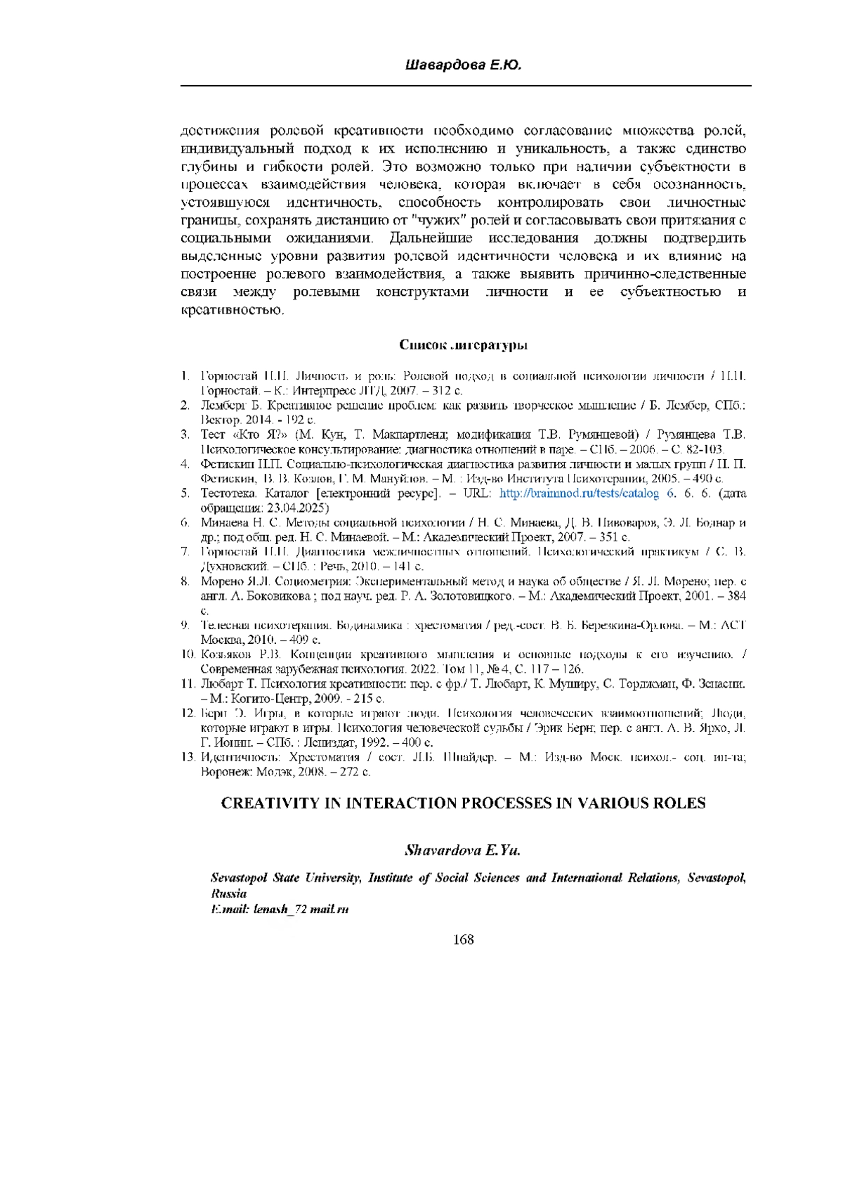 ШАВАРДОВА Е. Ю. ТВОРЧЕСКИЕ СПОСОБНОСТИ В ПРОЦЕССЕ РОЛЕВОГО ВЗАИМОДЕЙСТВИЯ // УЧЕНЫЕ ЗАПИСКИ КРЫМСКОГО ФЕДЕРАЛЬНОГО УНИВЕРСИТЕТА ИМЕНИ В. И. ВЕРНАДСКОГО. СОЦИОЛОГИЯ. ПЕДАГОГИКА. ПСИХОЛОГИЯ. 2025. ТОМ 11 (77). № 2