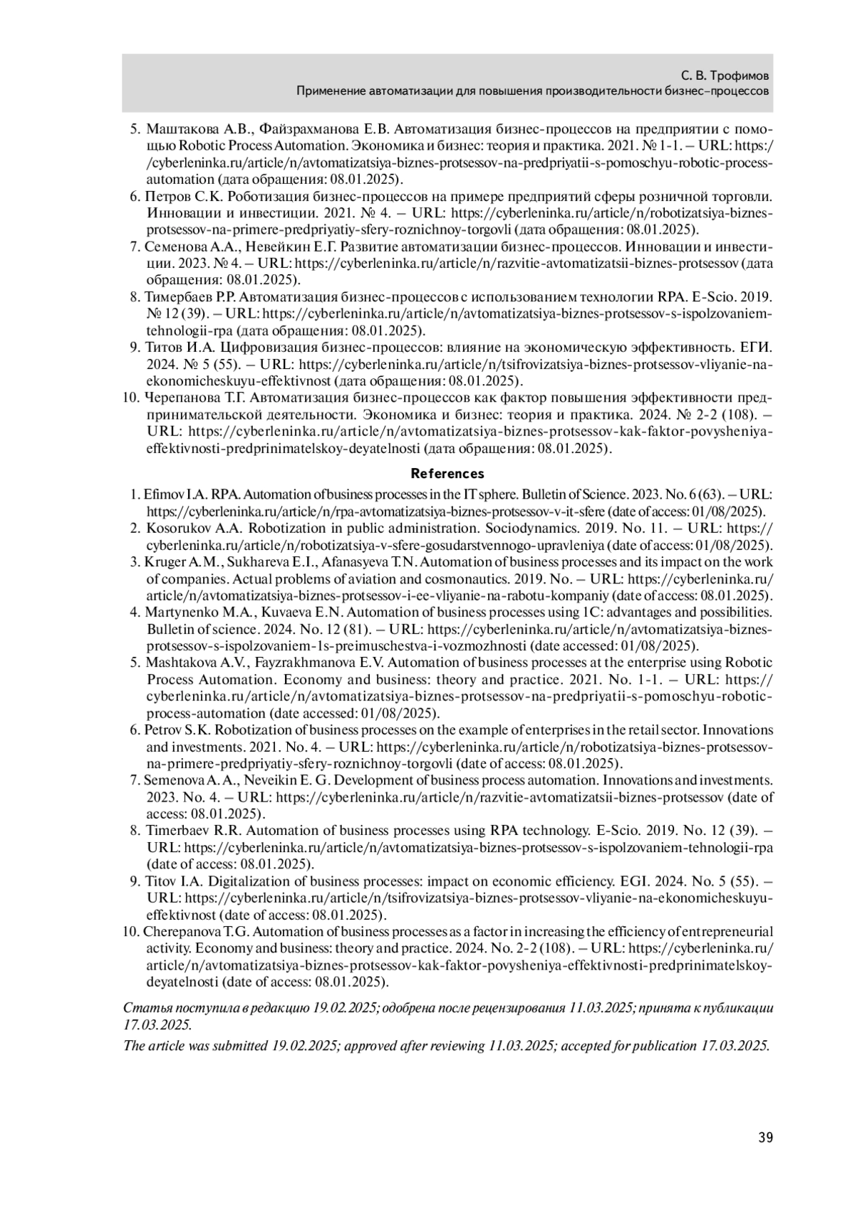 ТРОФИМОВ С. В. ПРИМЕНЕНИЕ АВТОМАТИЗАЦИИ ДЛЯ ПОВЫШЕНИЯ ПРОИЗВОДИТЕЛЬНОСТИ БИЗНЕС–ПРОЦЕССОВ // РОССИЙСКАЯ АКАДЕМИЯ ПРЕДПРИНИМАТЕЛЬСТВА. 2025. Т. 18, № 2