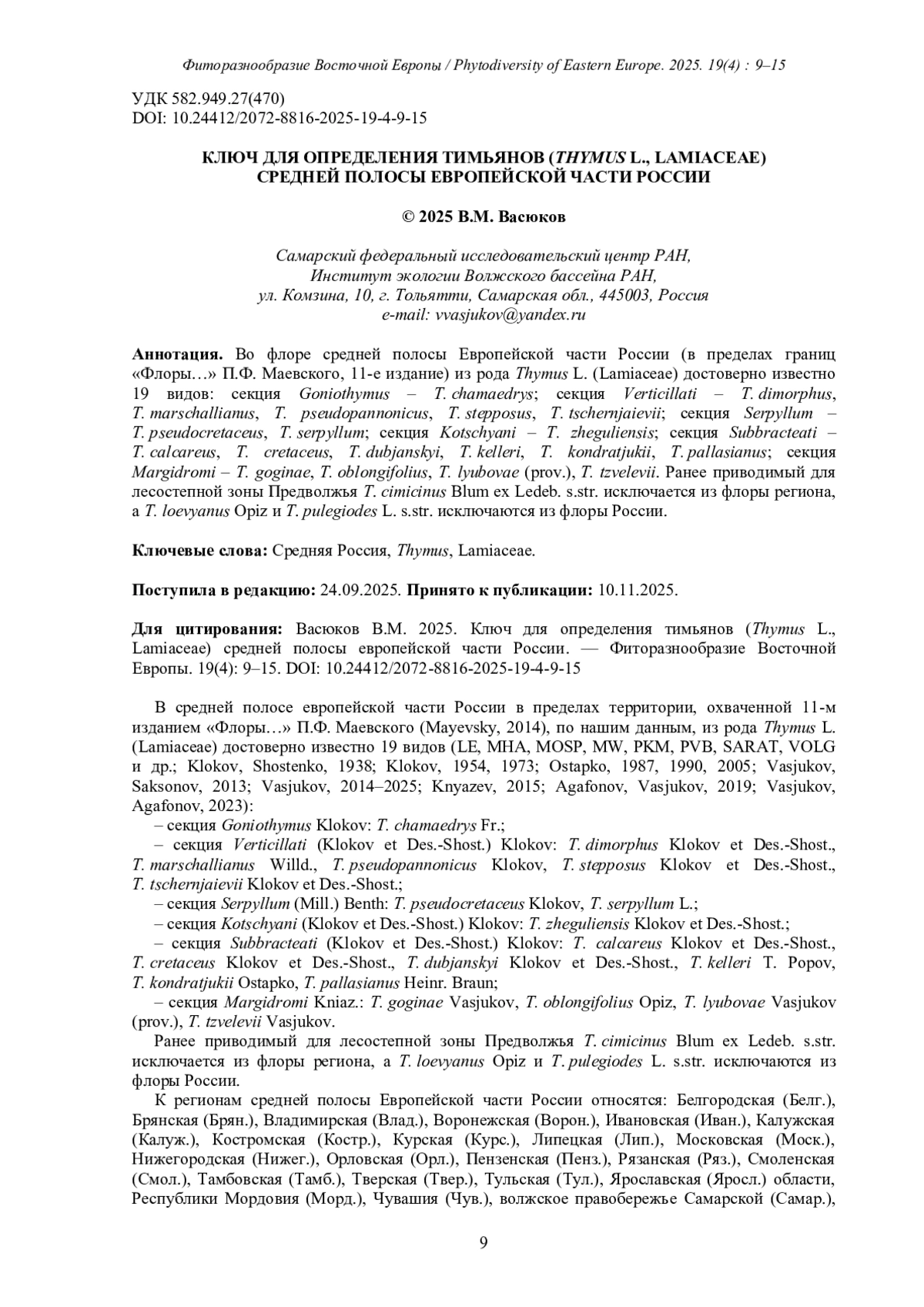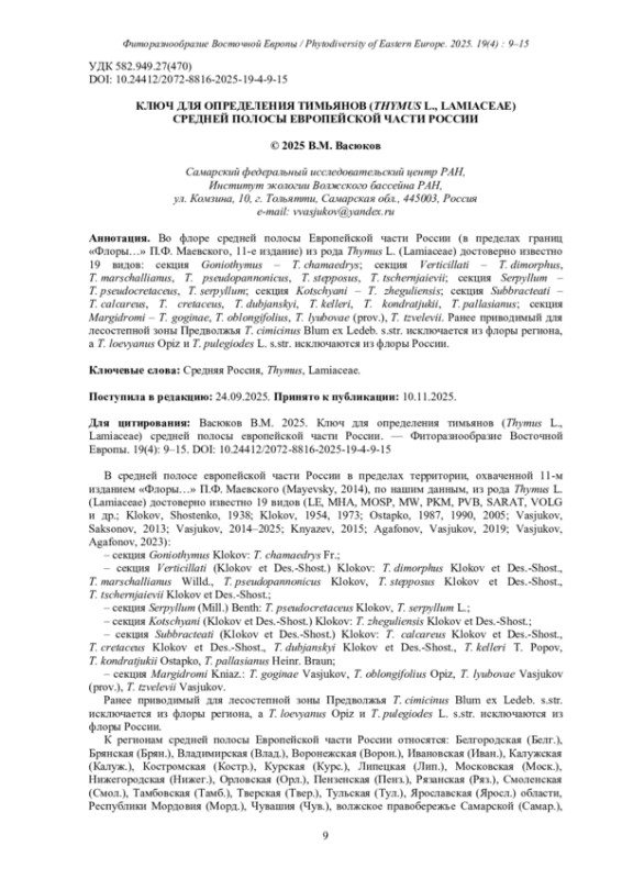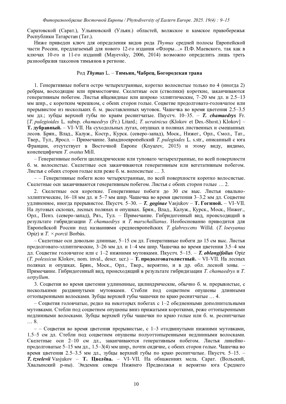 Во флоре средней полосы Европейской части России (в пределах границ «Флоры…» П. Ф. Маевского, 11-е издание) из рода Thymus L. (Lamiaceae) достоверно известно 19 видов: секция Goniothymus - T. chamaedrys; секция Verticillati - T. dimorphus, T. marschallianus, T. pseudopannonicus, T. stepposus, T. tschernjaievii; секция Serpyllum - T. pseudocretaceus, T. serpyllum; секция Kotschyani - T. zheguliensis; секция Subbracteati - T. calcareus, T. cretaceus, T. dubjanskyi, T. kelleri, T. kondratjukii, T. pallasianus; секция Margidromi - T. goginae, T. oblongifolius, T. lyubovae (prov.), T. tzvelevii. Ранее приводимый для лесостепной зоны Предволжья T. cimicinus Blum ex Ledeb. s. str. исключается из флоры региона, а T. loevyanus Opiz и T. pulegiodes L. s. str. исключаются из флоры России.