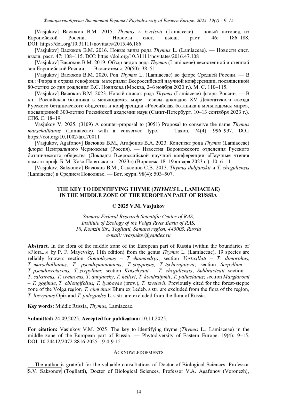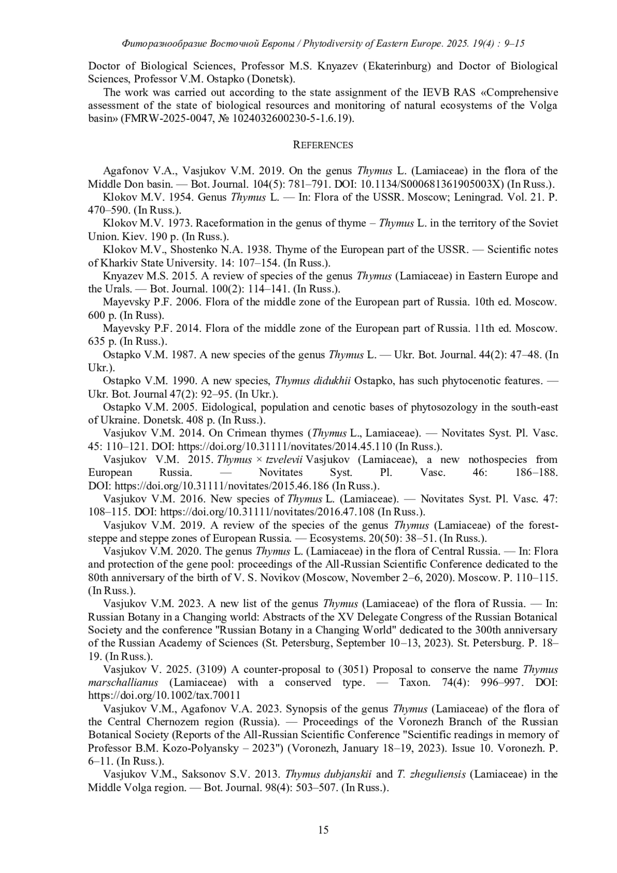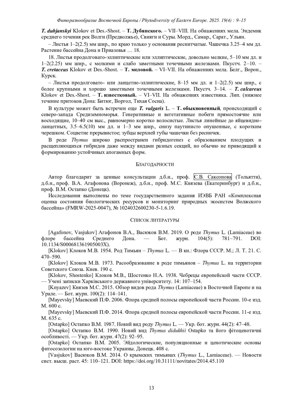 Во флоре средней полосы Европейской части России (в пределах границ «Флоры…» П. Ф. Маевского, 11-е издание) из рода Thymus L. (Lamiaceae) достоверно известно 19 видов: секция Goniothymus - T. chamaedrys; секция Verticillati - T. dimorphus, T. marschallianus, T. pseudopannonicus, T. stepposus, T. tschernjaievii; секция Serpyllum - T. pseudocretaceus, T. serpyllum; секция Kotschyani - T. zheguliensis; секция Subbracteati - T. calcareus, T. cretaceus, T. dubjanskyi, T. kelleri, T. kondratjukii, T. pallasianus; секция Margidromi - T. goginae, T. oblongifolius, T. lyubovae (prov.), T. tzvelevii. Ранее приводимый для лесостепной зоны Предволжья T. cimicinus Blum ex Ledeb. s. str. исключается из флоры региона, а T. loevyanus Opiz и T. pulegiodes L. s. str. исключаются из флоры России.