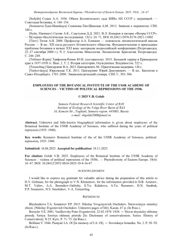 Как отметил Д. А. Медведев еще в 2009 г., большинство граждан нашей страны не могут назвать фамилии даже известных людей, которые пострадали или погибли в годы сталинских репрессий (http://kremlin. ru/events/president/news/5862). Что же говорить о простых гражданах? Я хочу привести краткие сведения о пострадавших от политических репрессий людях из близкой мне профессиональной сферы, которые работали в Ботаническом институте АН СССР, ограничиваясь, в основном, только второй половиной 1930-х годов. В рассмотренный скорбный список включены лица, невзирая на должности: будь то сторож, каким был А. И. Шипольский, или исполняющий обязанности директора Ботанического института, каковым являлся Ю. Д. Цинзерлинг. Не обращаю я также внимание и на длительность работы в институте, включив в список жертв репрессий сотрудников, проработавших в нем всего лишь несколько дней (П. П. Круглик).