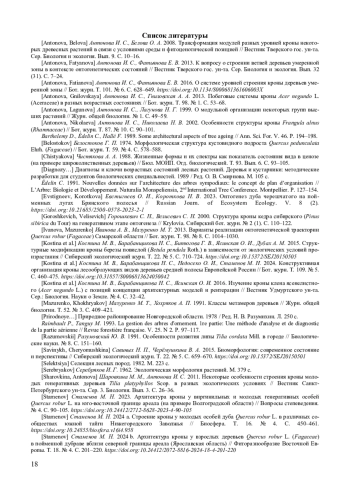 16. Костина М. В., Барабанщикова Н. С., Недосеко О. И., Стаменов М. Н. 2024. Конструктивная организация кроны лесообразующих видов деревьев средней полосы Европейской России // Бот. журн. Т. 109. № 5. С. 460-475. https://doi.org:. DOI: 10.31857/S0006813624050042