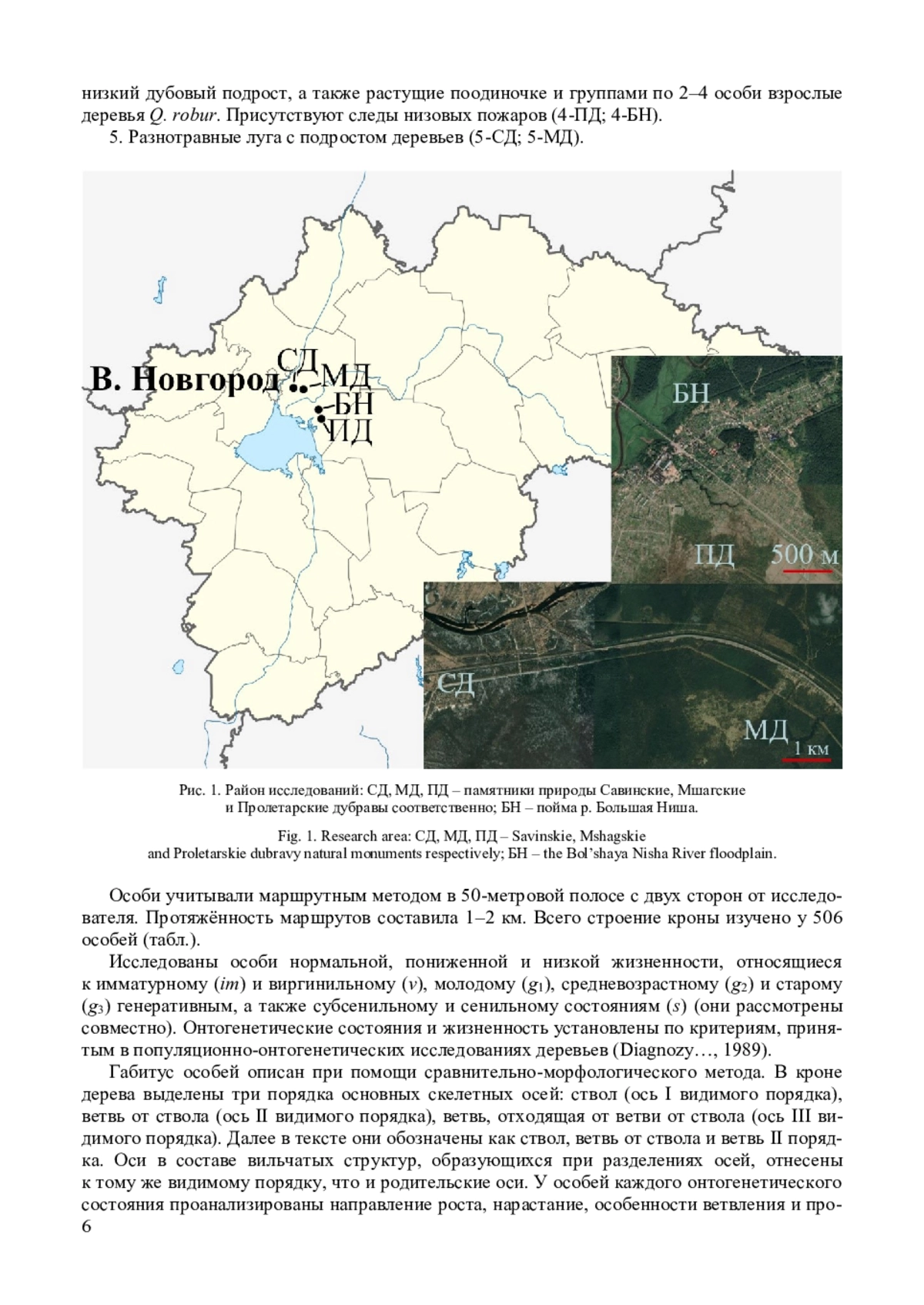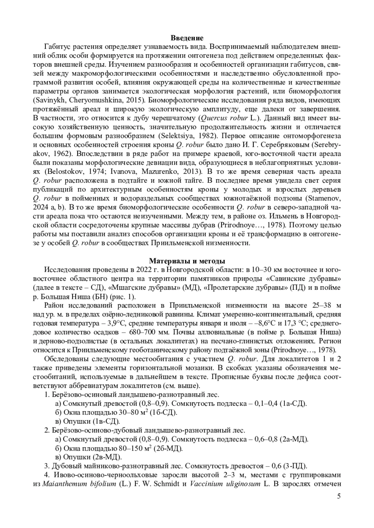 Габитус растения определяет узнаваемость вида. Воспринимаемый наблюдателем внеш-ний облик особи формируется на протяжении онтогенеза под действием определенных фак-торов внешней среды. Изучением разнообразия и особенностей организации габитусов, свя-зей между макроморфологическими особенностями и наследственно обусловленной про-граммой развития особей, влияния окружающей среды на количественные и качественные параметры органов занимается экологическая морфология растений, или биоморфология (Savinykh, Cheryomushkina, 2015). Биоморфологические исследования ряда видов, имеющих протяжённый ареал и широкую экологическую амплитуду, еще далеки от завершения. В частности, это относится к дубу черешчатому (Quercus robur L.). Данный вид имеет вы-сокую хозяйственную ценность, значительную продолжительность жизни и отличается большим формовым разнообразием (Selektsiya, 1982). Первое описание онтоморфогенеза и основных особенностей строения кроны Q. robur было дано И. Г. Серебряковым (Serebry-akov, 1962). Впоследствии в ряде работ на примере краевой, юго-восточной части ареала были показаны морфологические девиации вида, образующиеся в неблагоприятных услови-ях (Belostokov, 1974; Ivanova, Mazurenko, 2013). В то же время северная часть ареала Q. robur расположена в подтайге и южной тайге. В последнее время увидела свет серия публикаций по архитектурным особенностям кроны у молодых и взрослых деревьев Q. robur в пойменных и водораздельных сообществах южнотаёжной подзоны (Stamenov, 2024 a, b). В то же время биоморфологические особенности Q. robur в северо-западной ча-сти ареала пока что остаются неизученными. Между тем, в районе оз. Ильмень в Новгород-ской области сосредоточены крупные массивы дубрав (Prirodnoye…, 1978). Поэтому целью работы мы поставили анализ способов организации кроны и её трансформацию в онтогене-зе у особей Q. robur в сообществах Приильменской низменности.