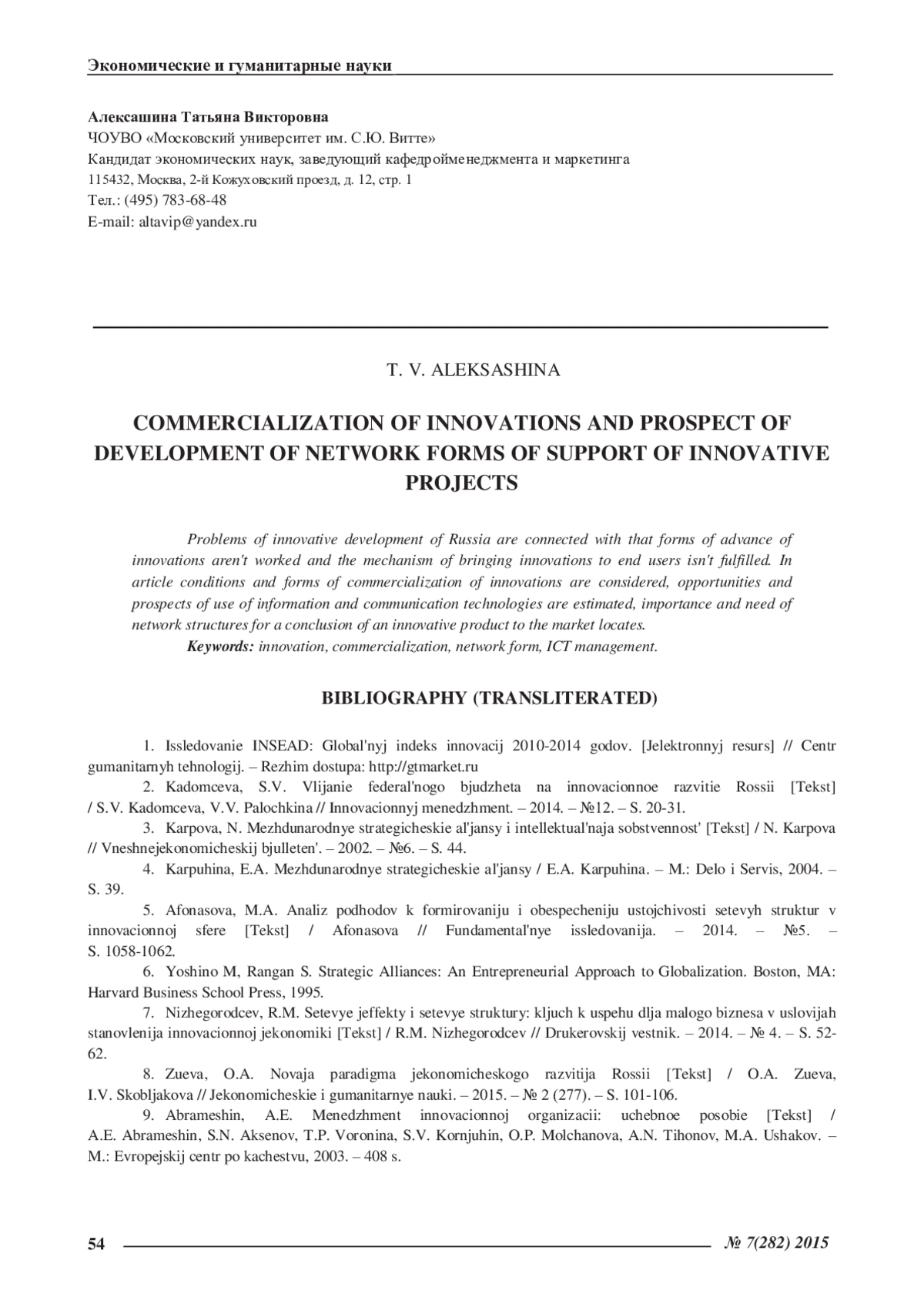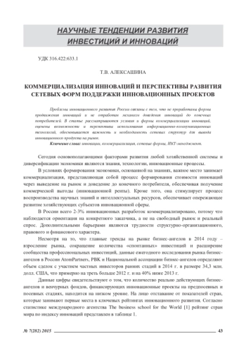 АЛЕКСАШИНА Т. В. КОММЕРЦИАЛИЗАЦИЯ ИННОВАЦИЙ И ПЕРСПЕКТИВЫ РАЗВИТИЯ СЕТЕВЫХ ФОРМ ПОДДЕРЖКИ ИННОВАЦИОННЫХ ПРОЕКТОВ // ЭКОНОМИЧЕСКИЕ И ГУМАНИТАРНЫЕ НАУКИ. 2015. № 7 (282)