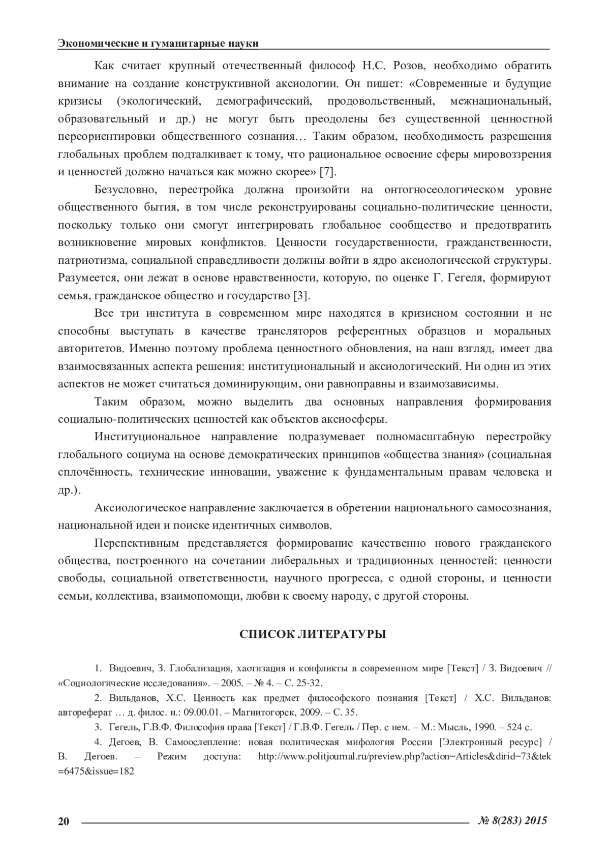 2. Вильданов, Х.С. Ценность как предмет философского познания [Текст] / Х.С. Вильданов: автореферат … д. филос. н.: 09.00.01. - Магнитогорск, 2009. - С. 35. EDN: NKWZEF