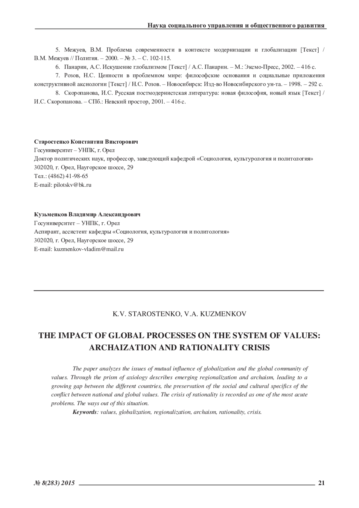5. Межуев, В.М. Проблема современности в контексте модернизации и глобализации [Текст] / В.М. Межуев // Полития. - 2000. - № 3. - С. 102-115. EDN: SYMQFJ