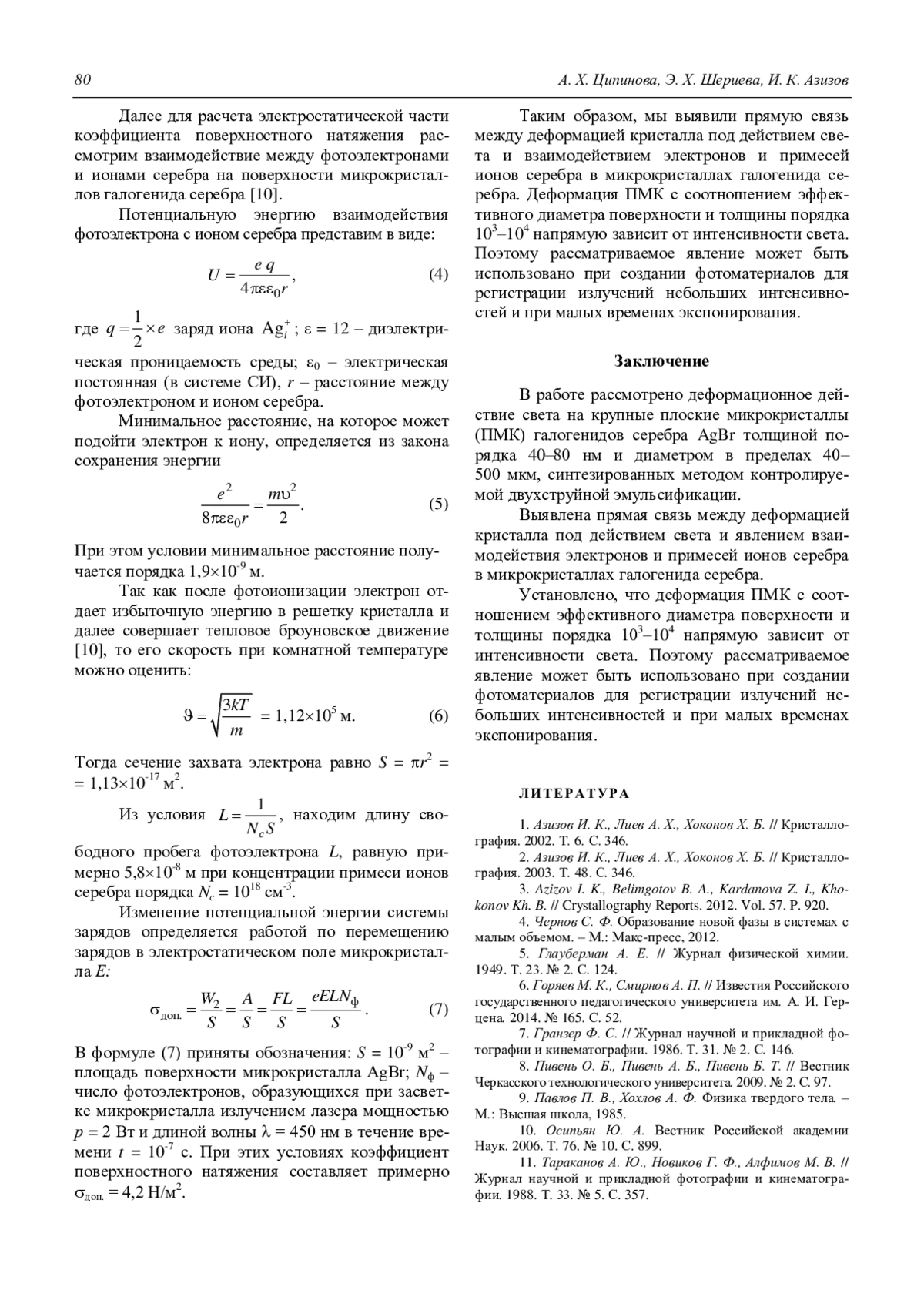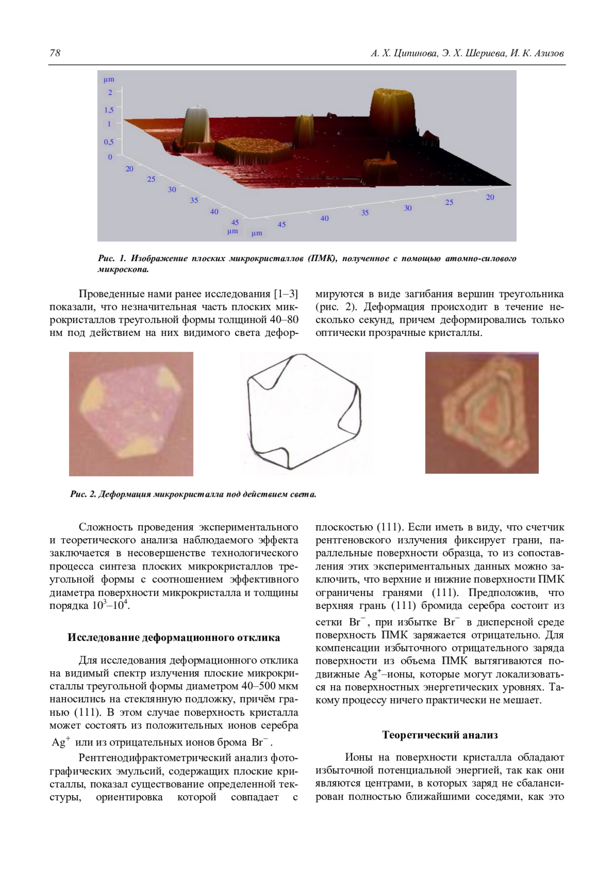 ЦИПИНОВА А. Х., ШЕРИЕВА Э. Х., АЗИЗОВ И. К. ДЕФОРМАЦИОННЫЙ ОТКЛИК ПЛОСКИХ МИКРОКРИСТАЛЛОВ ГАЛОГЕНИДА СЕРЕБРА AGBR НА ИЗЛУЧЕНИЕ ВИДИМОГО СПЕКТРА // ПРИКЛАДНАЯ ФИЗИКА. 2019. №1
