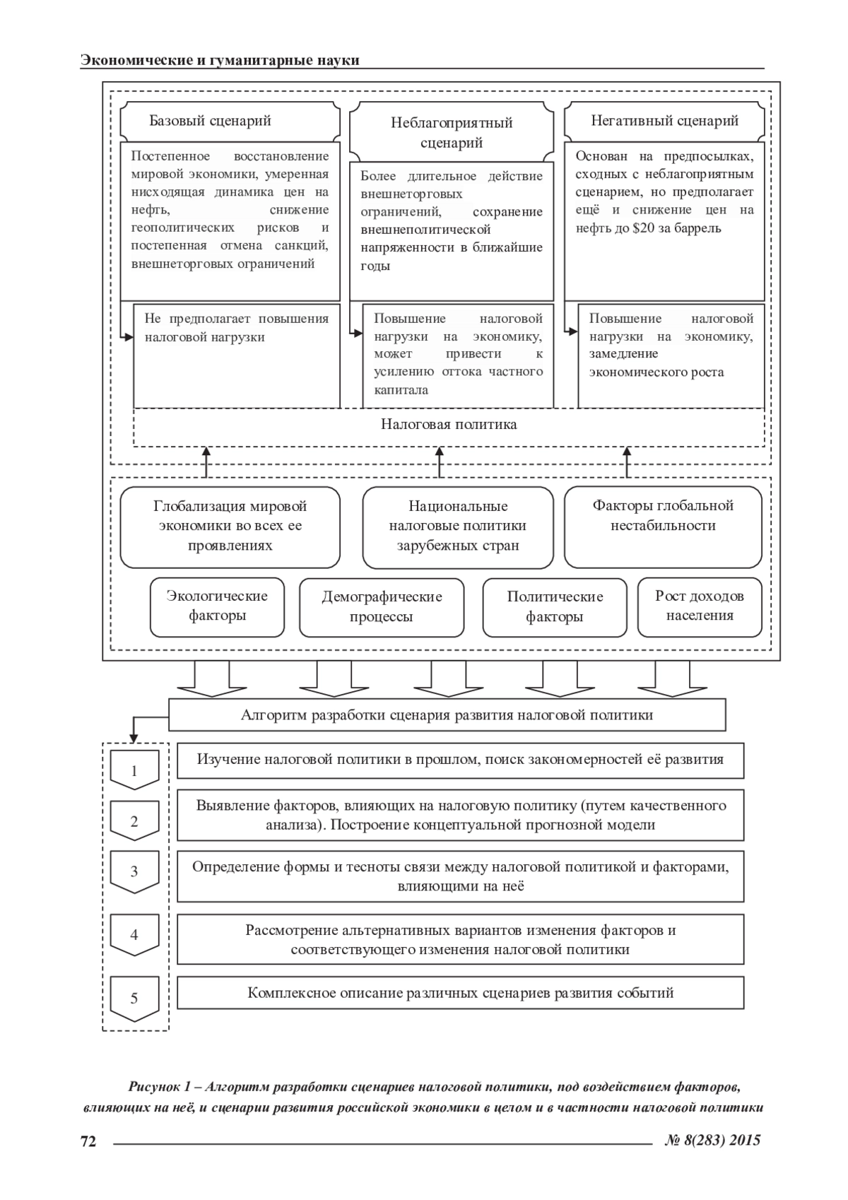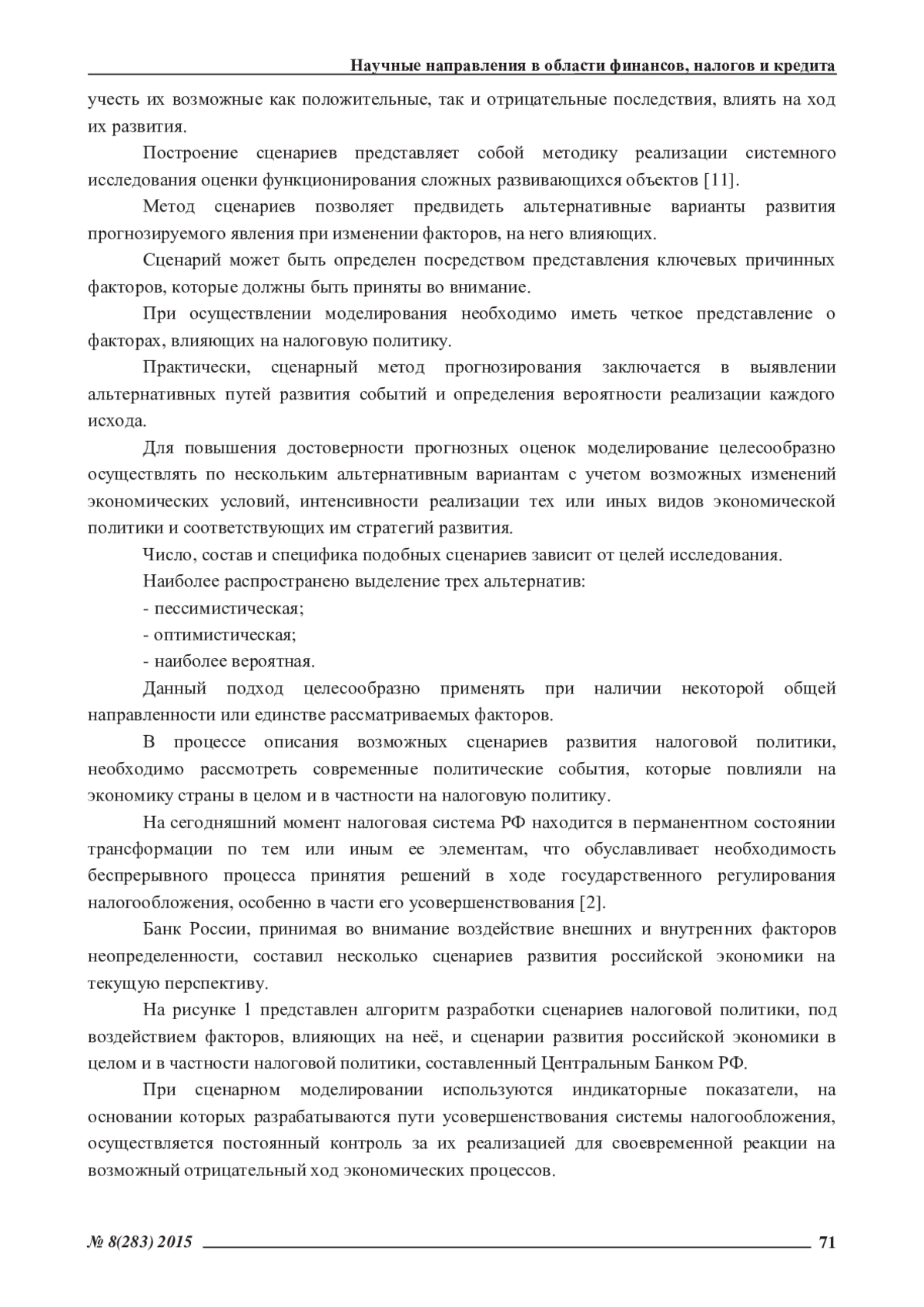 В статье рассмотрены алгоритм разработки сценариев налоговой политики, под воздействием факторов, влияющих на неё, и сценарии развития российской экономики в целом и в частности налоговой политики, а также алгоритм реализации сценариев налоговой политики.