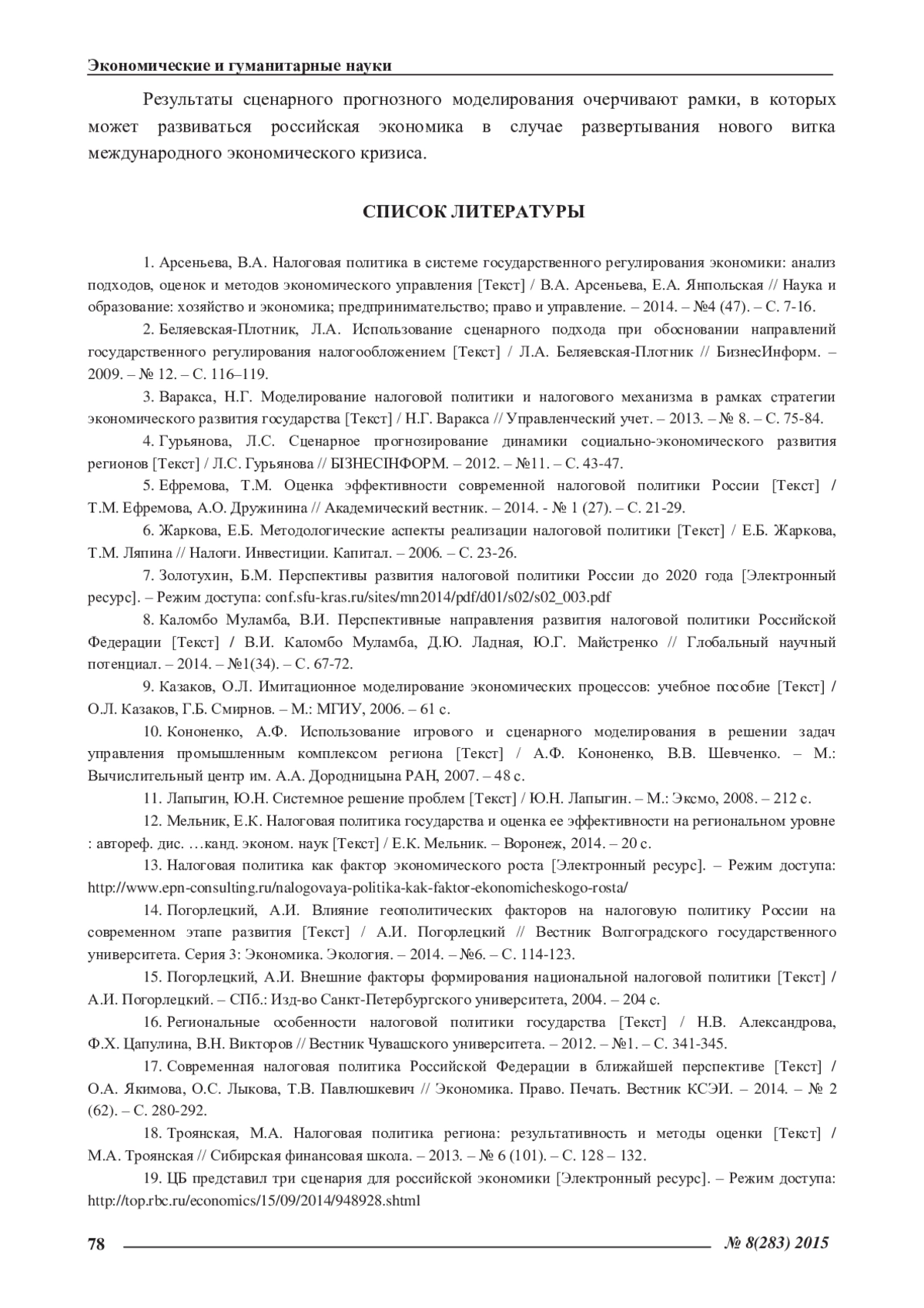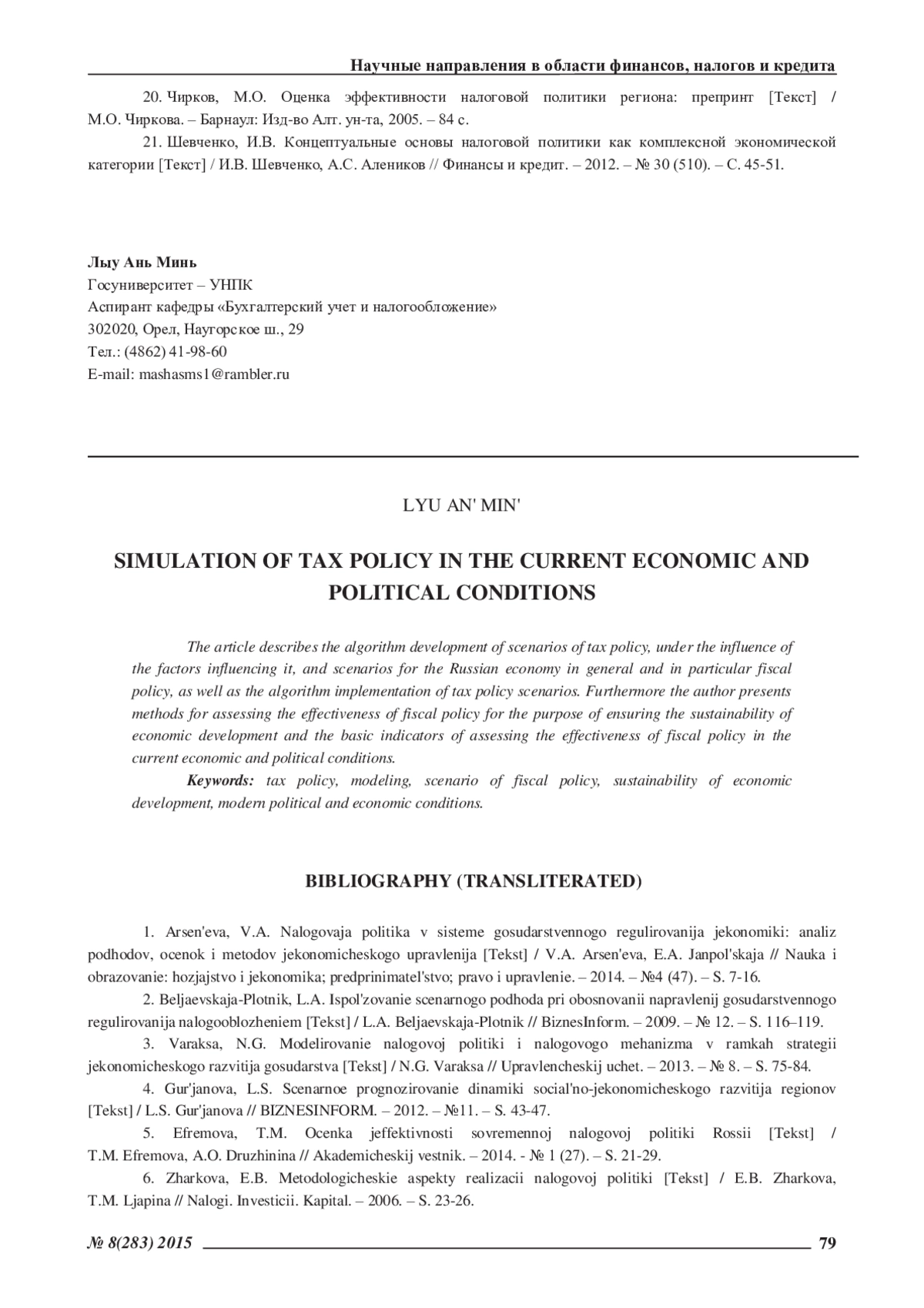 ЛЫУ А. М. МОДЕЛИРОВАНИЕ НАЛОГОВОЙ ПОЛИТИКИ В СОВРЕМЕННЫХ ЭКОНОМИЧЕСКИХ И ПОЛИТИЧЕСКИХ УСЛОВИЯХ // ЭКОНОМИЧЕСКИЕ И ГУМАНИТАРНЫЕ НАУКИ. 2015. № 8 (283)