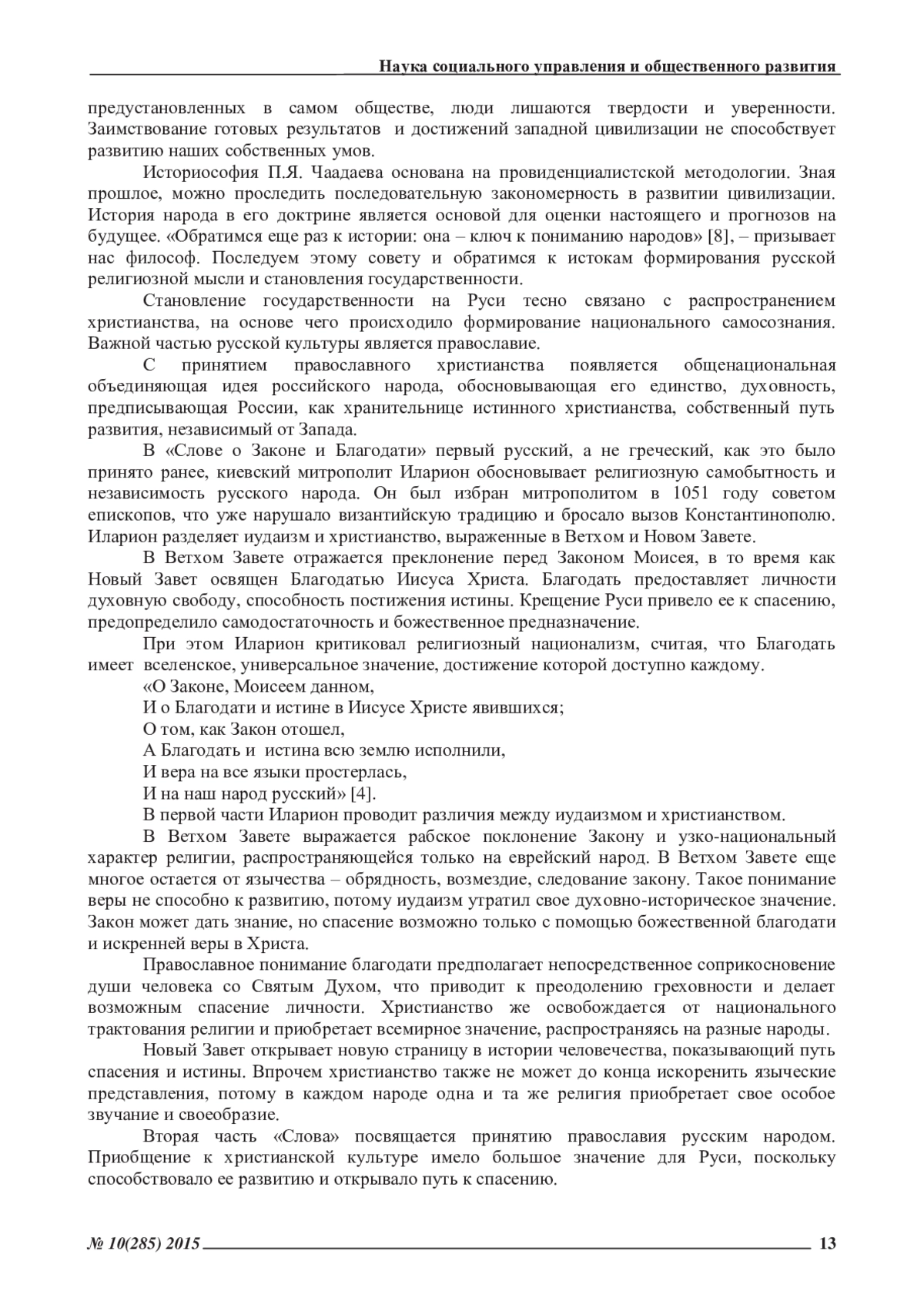 В данной статье рассматривается понятие самобытности в его последовательном развитии от Илариона до Филофея. По мнению автора, самобытность является основополагающим концептом русской философии. Впервые теоретическое обоснование самобытности было предложено П. Я. Чаадаевым, который также заложил основы русской историософии. Истоком культурного и государственного своеобразия любого народа мыслитель определял религию. Чтобы разобраться в особенностях современных тенденций в России и спрогнозировать ее будущее развитие, П. Я. Чаадаев призывает обратиться к истории страны, в особенности к истории становления религии. Принятие православия на Руси было важной вехой в становлении государственности и национального самосознания. Исследование источников показало, что самоопределение русского народа развивалось в постепенном отделении себя от других народов