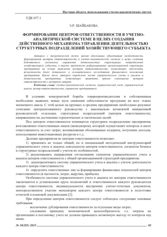 3. Шайбакова, Э.Р. Основы формирования центров ответственности и организация их учета [Текст] / Э.Р. Шайбакова // Экономические и гуманитарные науки. - 2010. - №5. EDN: MBGSVB