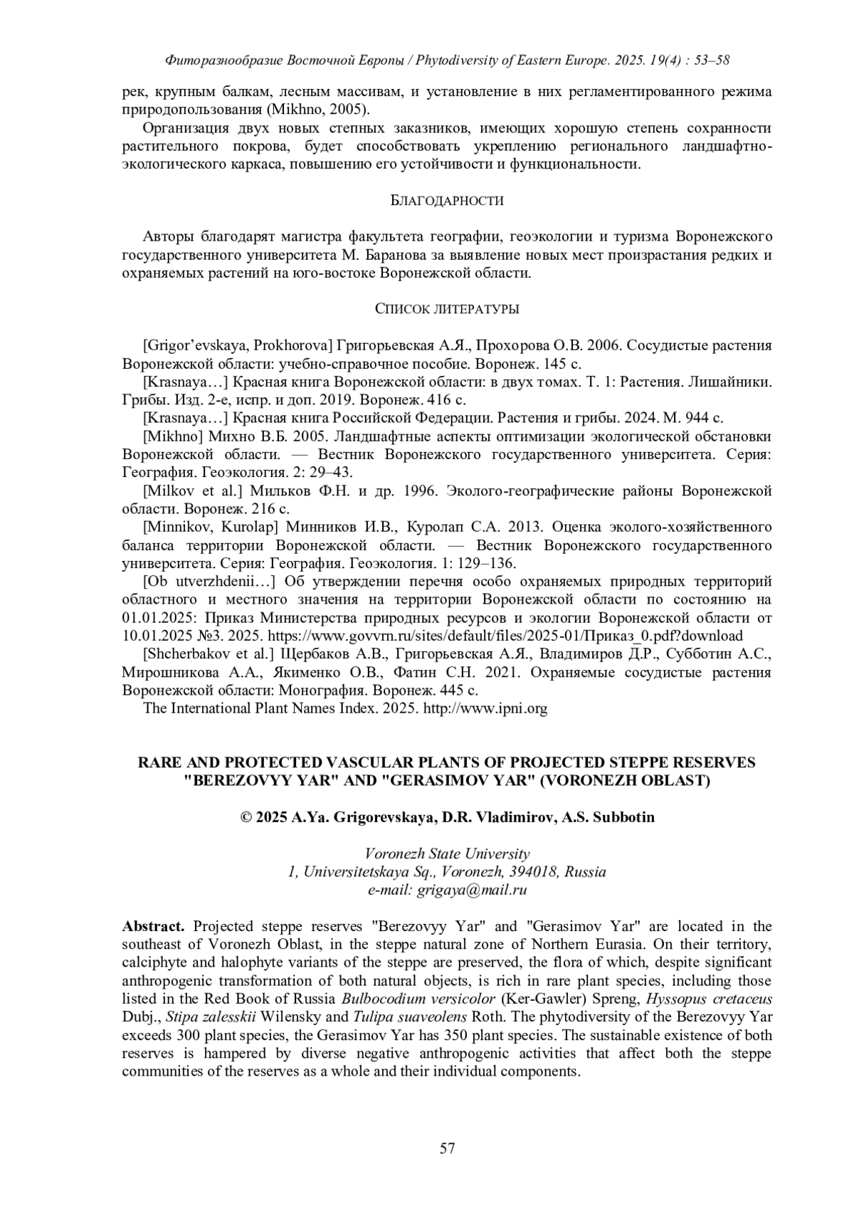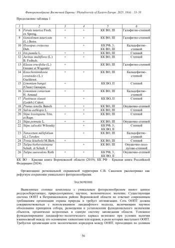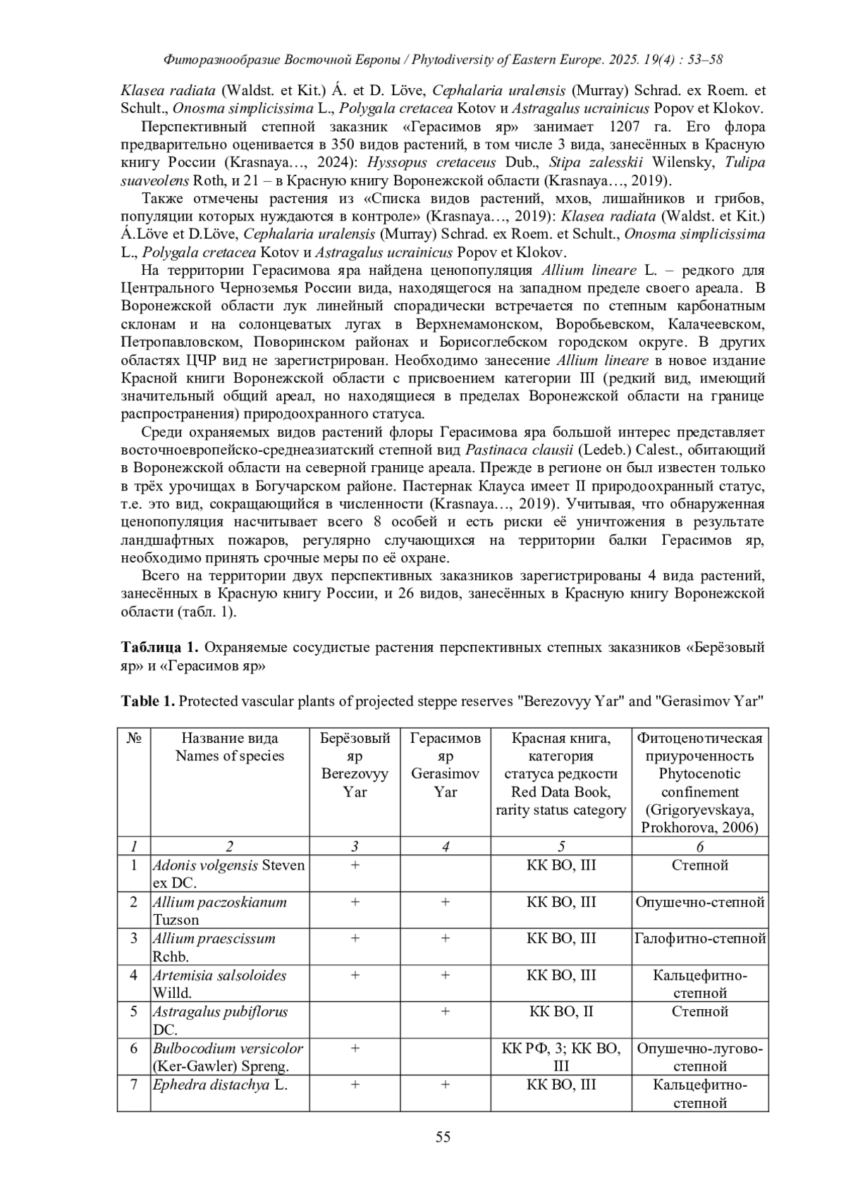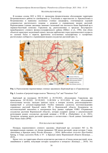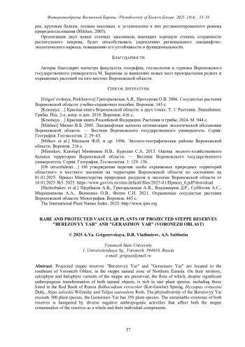 Перспективные степные заказники «Берёзовый яр» и «Герасимов яр» располагаются на юго-востоке Воронежской области, в степной природной зоне Северной Евразии. На их территории сохраняются кальцефитные и галофитные варианты степи, флора которых, несмотря на существенную антропогенную трансформацию обоих природных объектов, богата редкими видами растений, в том числе и занесёнными в Красную книгу России Bulbocodium versicolor (Ker-Gawler) Spreng, Hyssopus cretaceus Dubj., Stipazalesskii Wilensky и Tulipasuaveolens Roth. Фиторазнообразие заказника «Берёзовый яр» превышает 300 видов растений, заказника «Герасимов яр» составляет 350 видов. Устойчивому существованию перспективных ООПТ препятствует разносторонняя негативная антропогенная деятельность, которая влияет как на степные сообщества перспективных ООПТ в целом, так и на отдельные их компоненты.