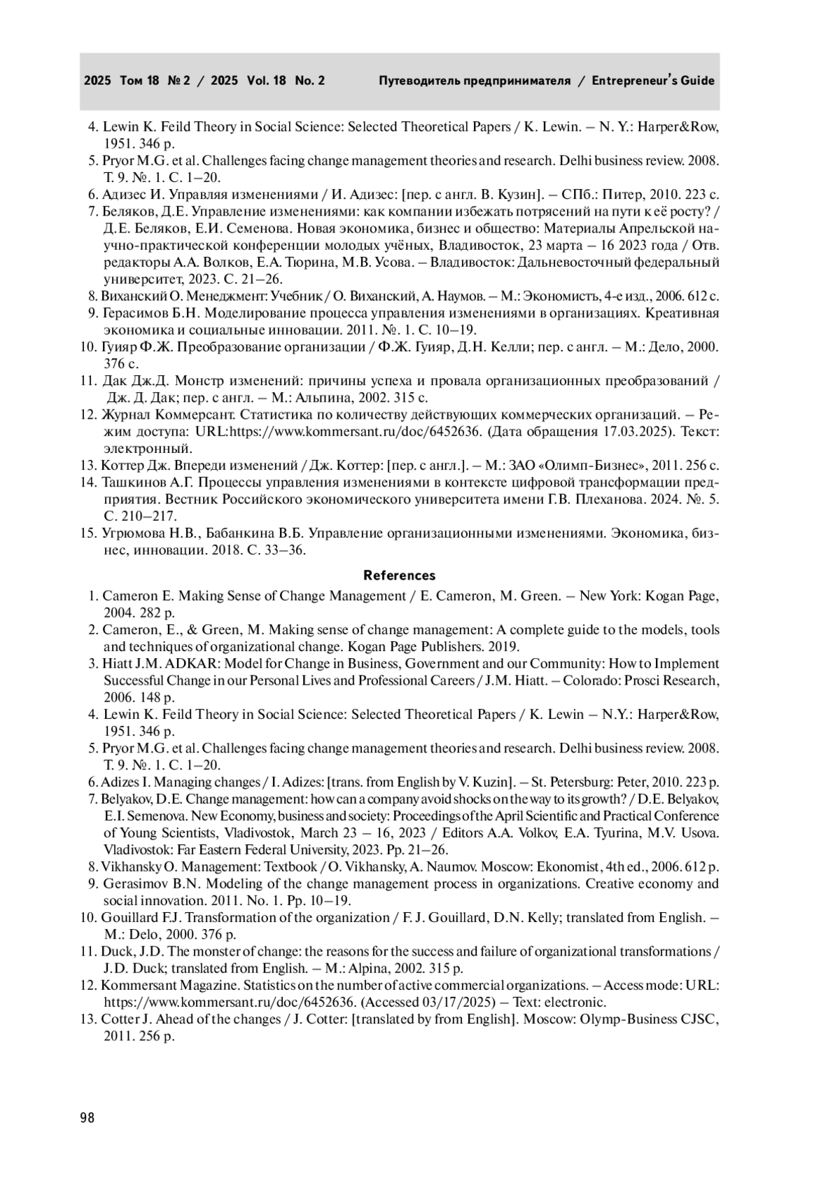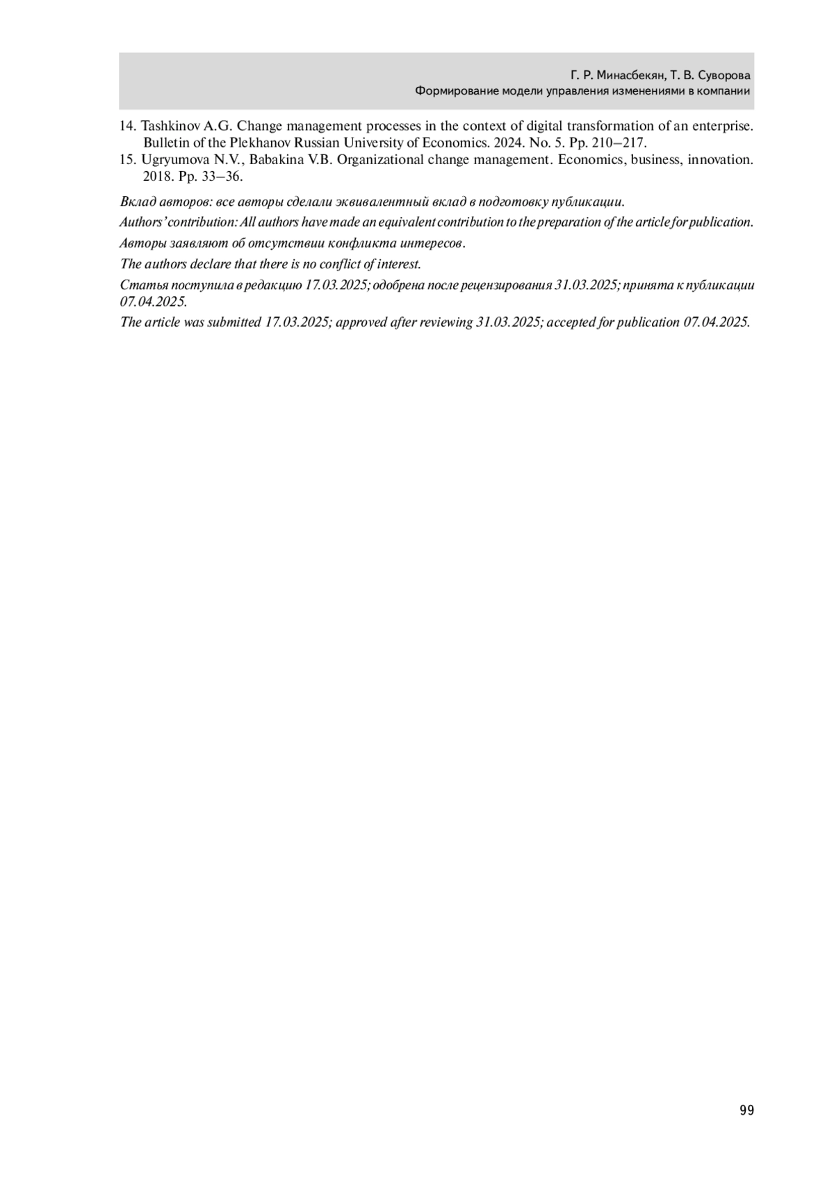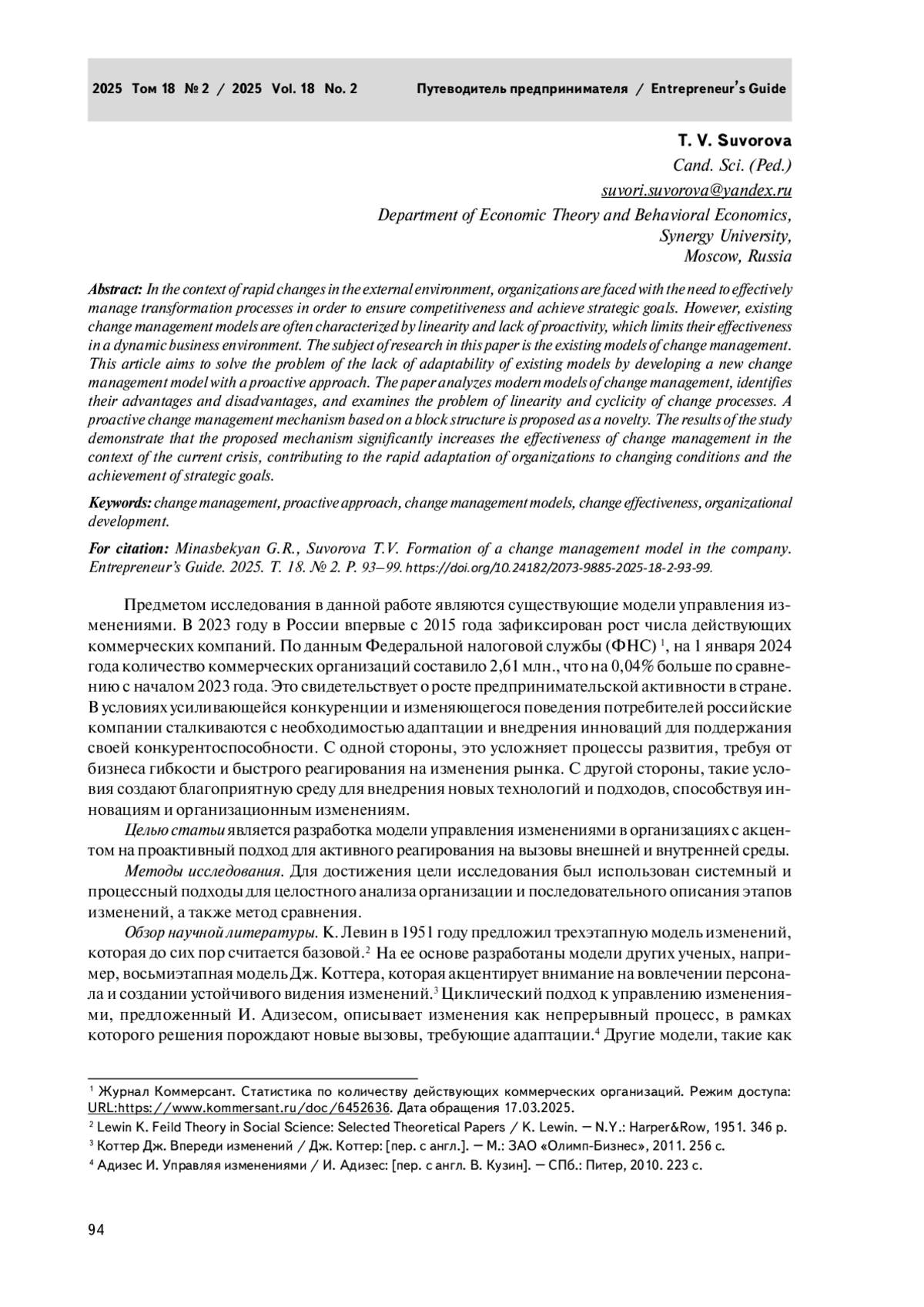 МИНАСБЕКЯН Г. Р., СУВОРОВА Т. В. ФОРМИРОВАНИЕ МОДЕЛИ УПРАВЛЕНИЯ ИЗМЕНЕНИЯМИ В КОМПАНИИ // РОССИЙСКАЯ АКАДЕМИЯ ПРЕДПРИНИМАТЕЛЬСТВА. 2025. Т. 18, № 2