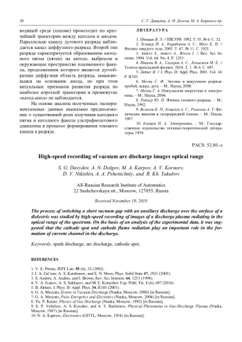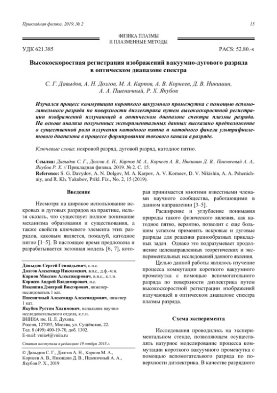 Давыдов С. Г., Долгов А. Н., Карпов М. А., Корнеев А. В., Никишин Д. В., Пшеничный А. А., Якубов Р. Х. Высокоскоростная регистрация изображений вакуумно-дугового разряда в оптическом диапазоне спектра 15