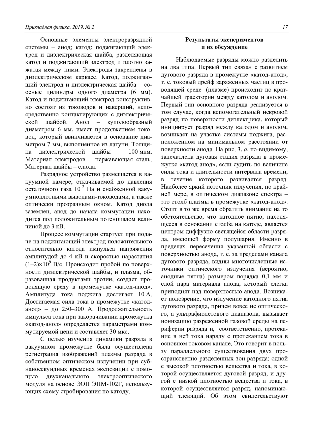 Наблюдаемые разряды можно разделить на два типа. Первый тип связан с развитием дугового разряда в промежутке «катод-ано», т. е. токовый дрейф заряженных частиц в проводящей среде (плазме) происходит по кратчайшей траектории между катодом и анодом. Параллельно каналу дугового разряда наблюдается канал диффузного разряда. Второй тип разряда характеризуется образованием катодного пятна (пятен) на катоде, выбросом в окружающее пространство плазменного факела, продолжением которого является дугообразная диффузная область разряда, замыкающаяся на основание анода, но при этом визуальных признаков развития разряда по наиболее короткой траектории в промежутке «катод-анод» не наблюдается.