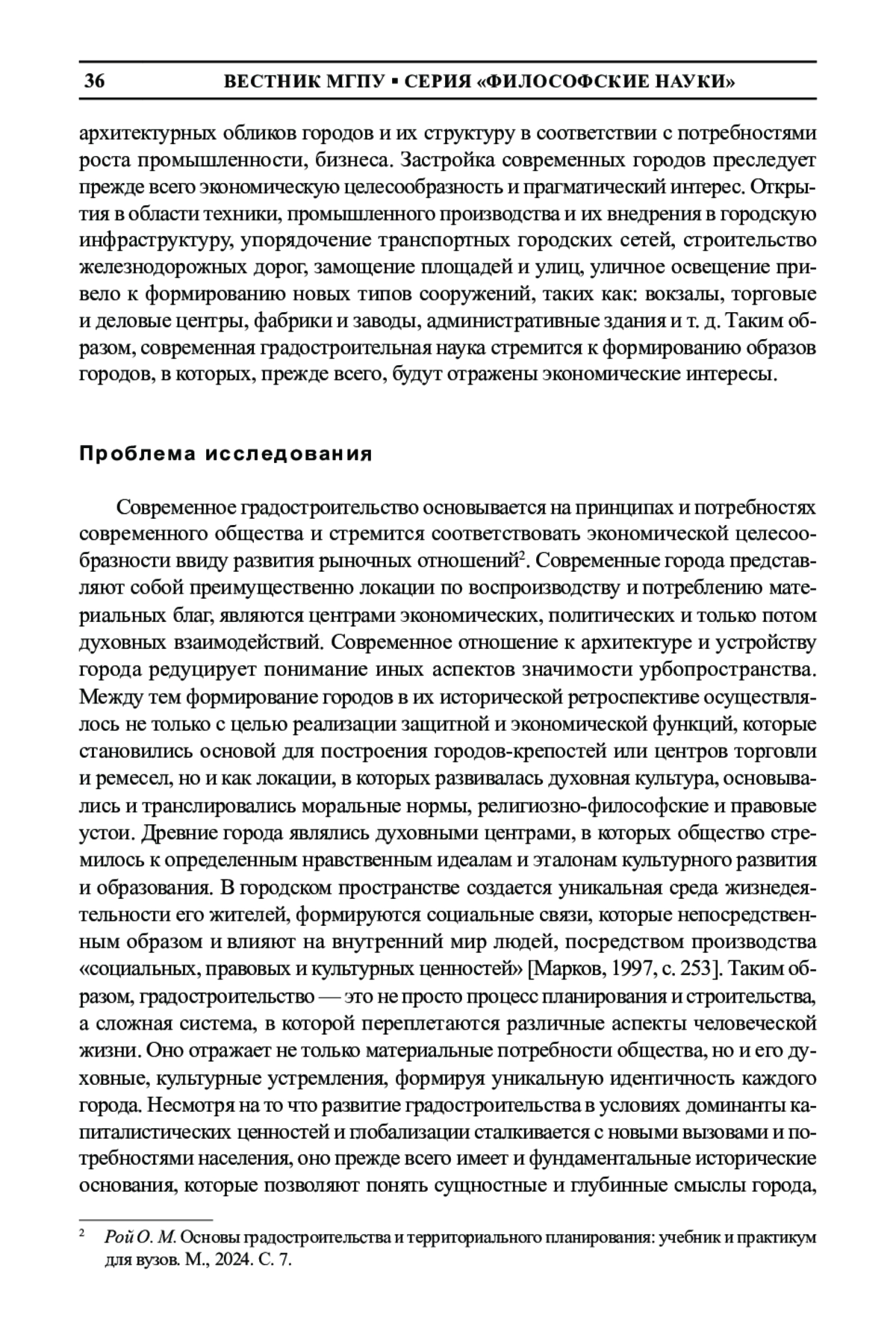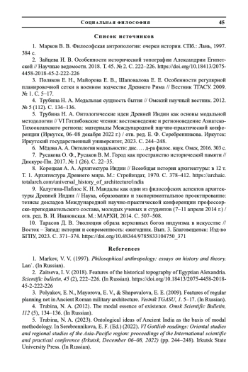 В статье исследуется особенность формирования древнеиндийских городов как отражение религиозно-философского мировоззрения. Междисциплинарный анализ включает в себя историческое рассмотрение проблемы формирования городов в контексте исторических и культурных ценностей; философское (историко-философское, онтологическое, эстетическое, социокультурное) рассмотрение проблемы формирования образа города в соответствии с мировоззренческими и онтологическими установками. Результаты междисциплинарного подхода позволили выявить, что в основе градостроительства Древней Индии содержались религиозно-философские идеи брахманизма и индуизма. Планировка, социальная структура и архитектура древнеиндийских городов являлись символическими и священными актами, направленными на создание гармоничного и целостного пространства, отраженного в ведических канонах.
