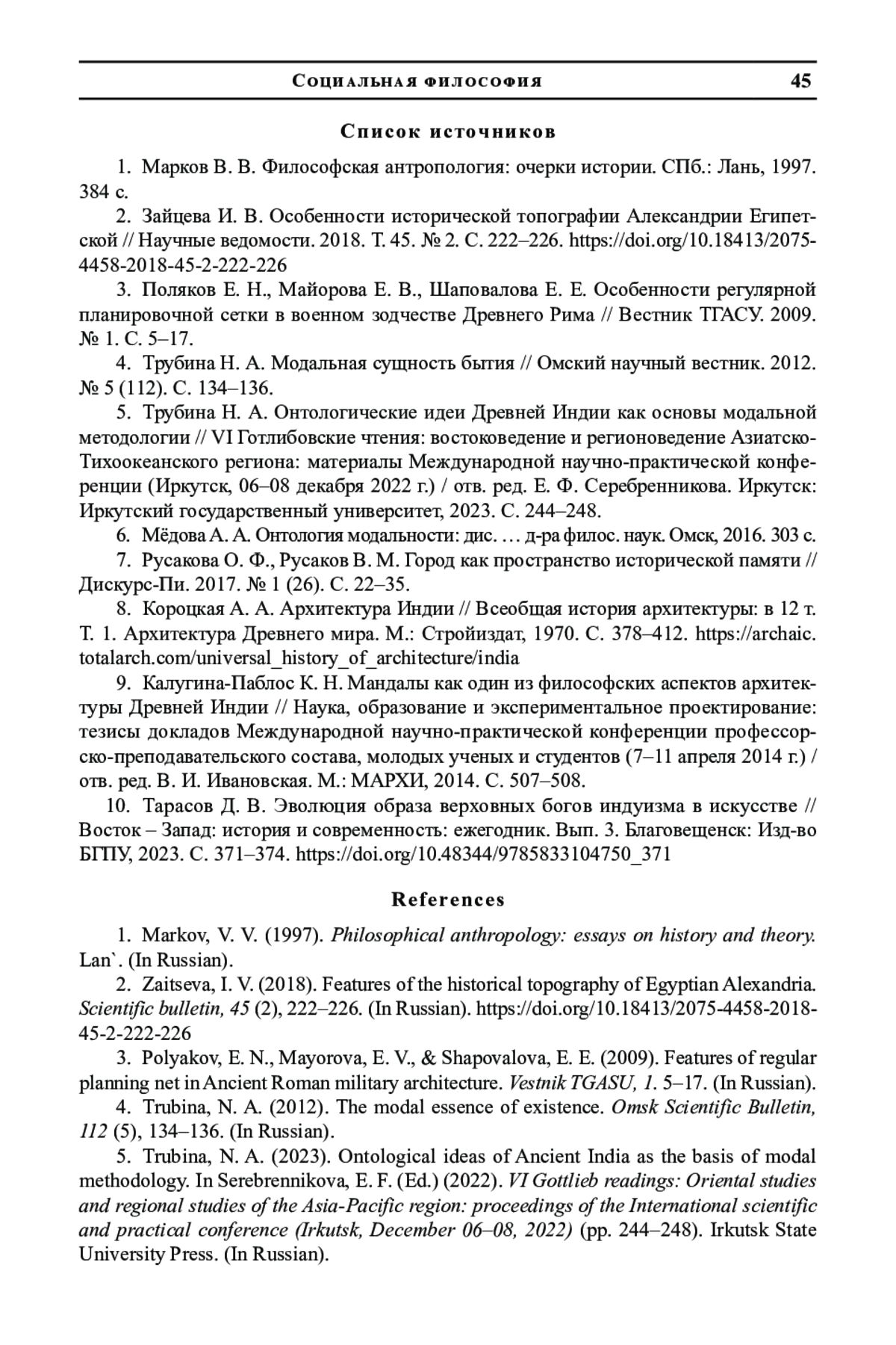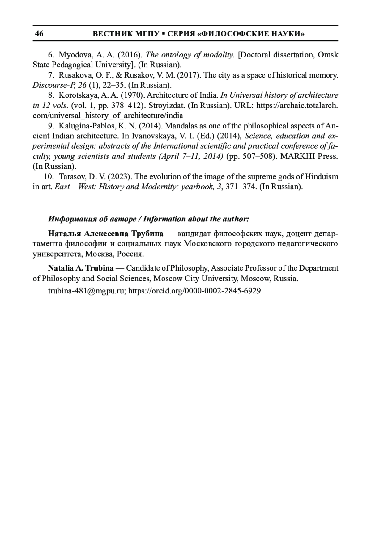 5. Трубина Н. А. Онтологические идеи Древней Индии как основы модальной методологии // VI Готлибовские чтения: востоковедение и регионоведение Азиатско-Тихоокеанского региона: материалы Международной научно-практической конференции (Иркутск, 06-08 декабря 2022 г.) / отв. ред. Е. Ф. Серебренникова. Иркутск: Иркутский государственный университет, 2023. С. 244-248. EDN: DTPDOE