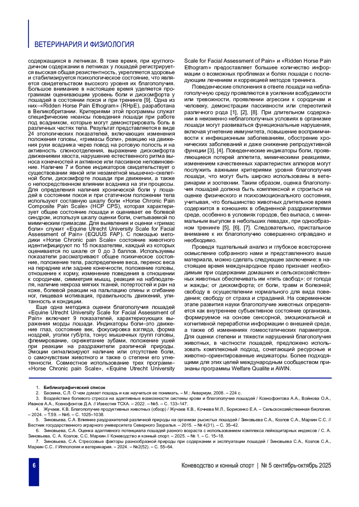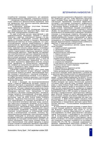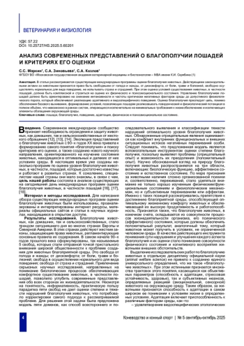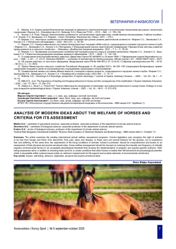 МАРКИН С. С., ЗИНОВЬЕВА С. А., КОЗЛОВ С. А. АНАЛИЗ СОВРЕМЕННЫХ ПРЕДСТАВЛЕНИЙ О БЛАГОПОЛУЧИИ ЛОШАДЕЙ И КРИТЕРИЯХ ЕГО ОЦЕНКИ // КОНЕВОДСТВО И КОННЫЙ СПОРТ. 2025. № 5