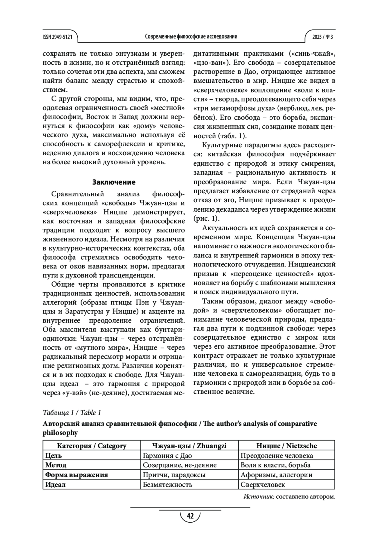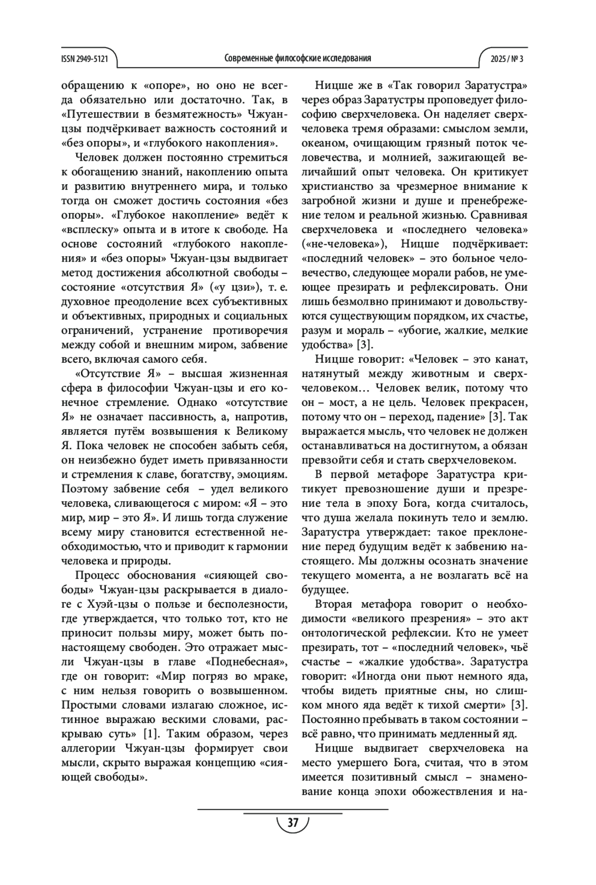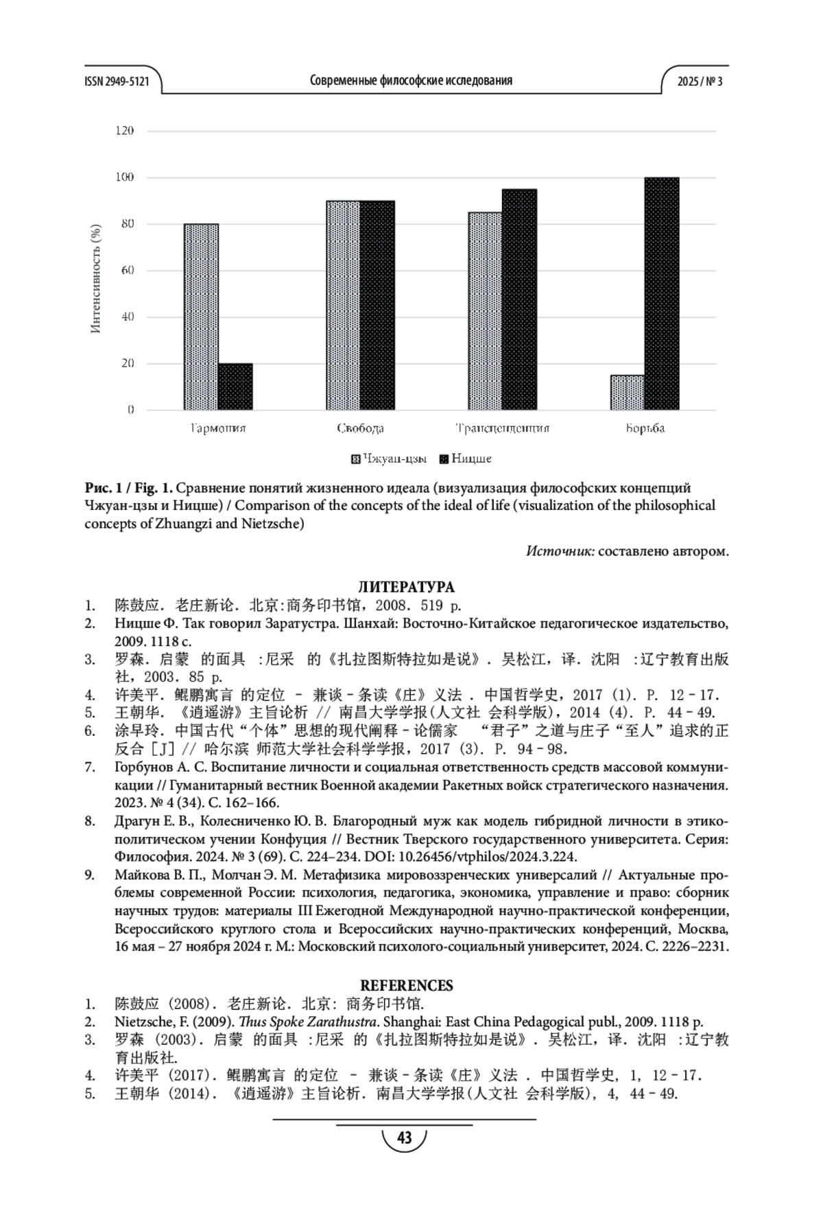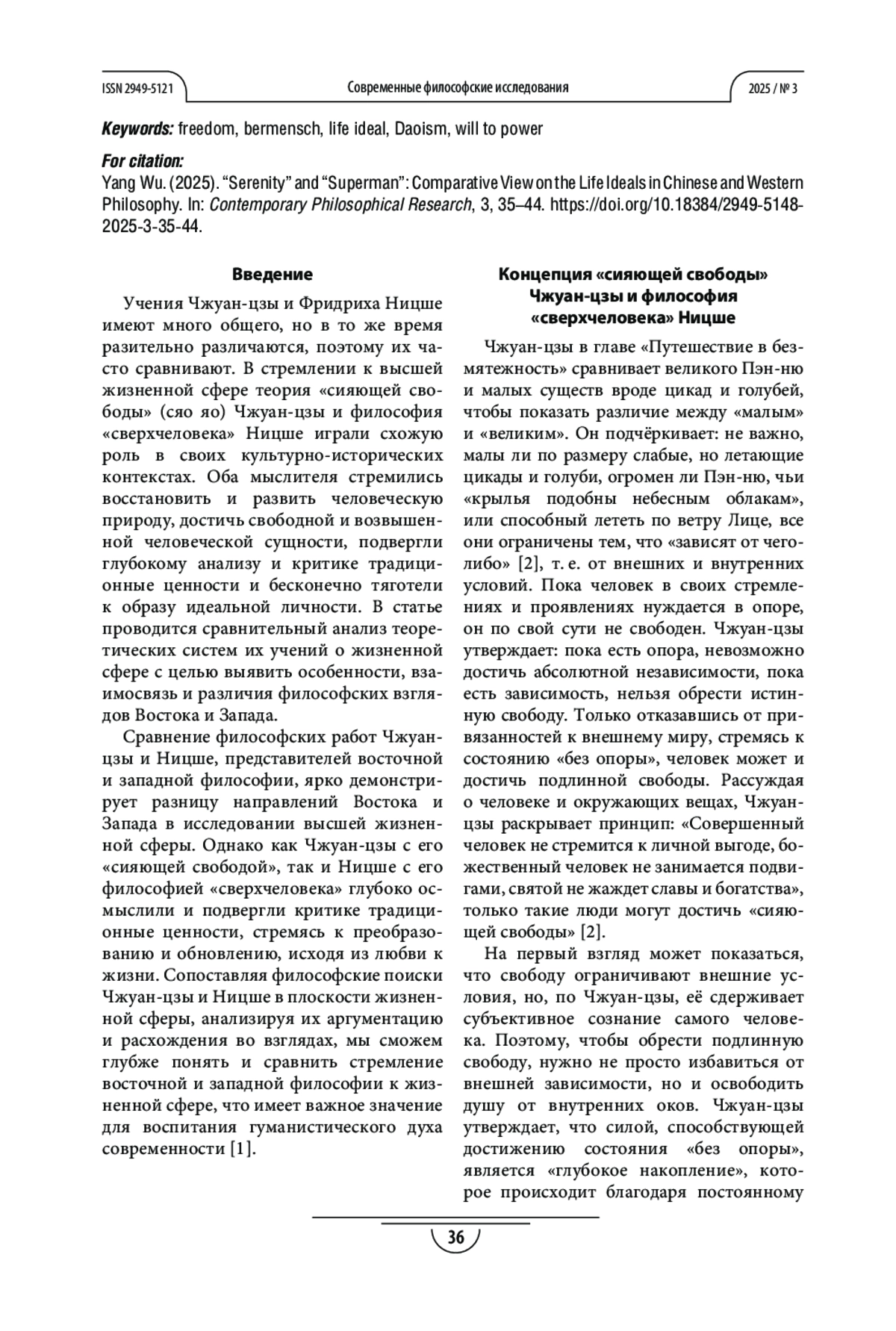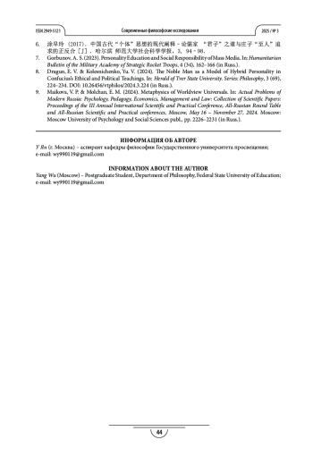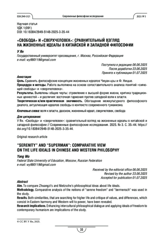 У Я. «СВОБОДА» И «СВЕРХЧЕЛОВЕК»: СРАВНИТЕЛЬНЫЙ ВЗГЛЯД НА ЖИЗНЕННЫЕ ИДЕАЛЫ В КИТАЙСКОЙ И ЗАПАДНОЙ ФИЛОСОФИИ // СОВРЕМЕННЫЕ ФИЛОСОФСКИЕ ИССЛЕДОВАНИЯ. 2025. № 3