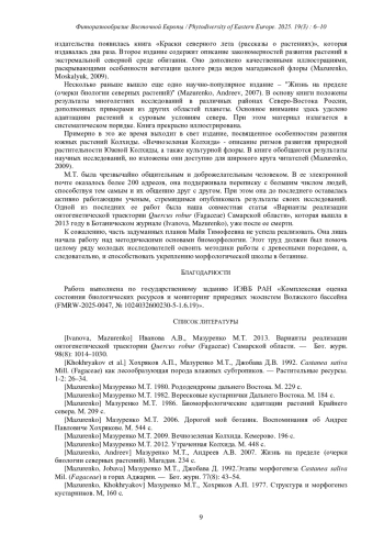 1. [Ivanova, Mazurenko] Иванова А.В., Мазуренко М.Т. 2013. Варианты реализации онтогенетической траектории Quercus robur (Fagaceae) Самарской области. - Бот. журн. 98(8): 1014-1030.