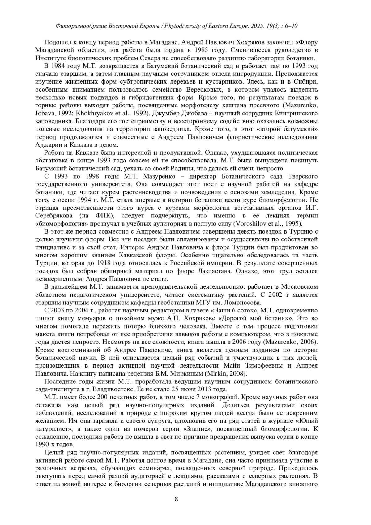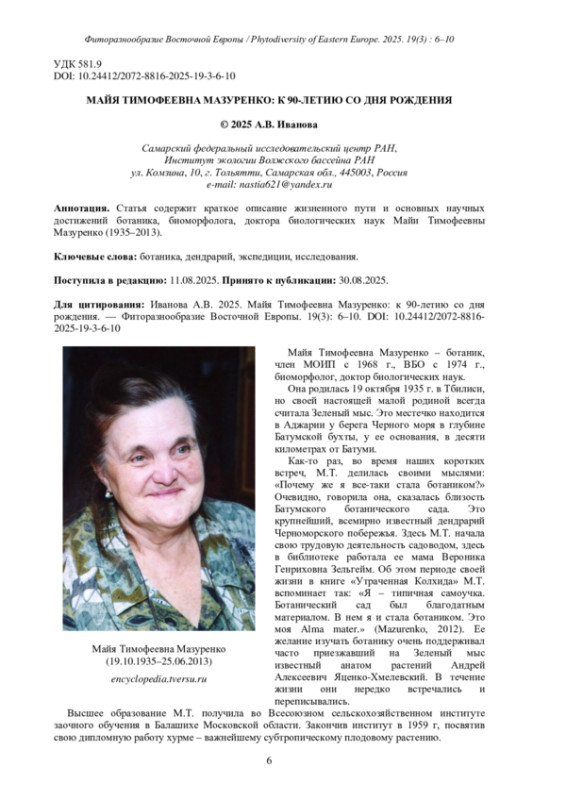 14. [Voroshilov et al.] Ворошилов В.Н., Куваев В.Б., Тихомиров В.Н. 1995. Майя Тимофеевна Мазуренко. - Бюл. МОИП. Отд. биол. 100(3): 98-100.