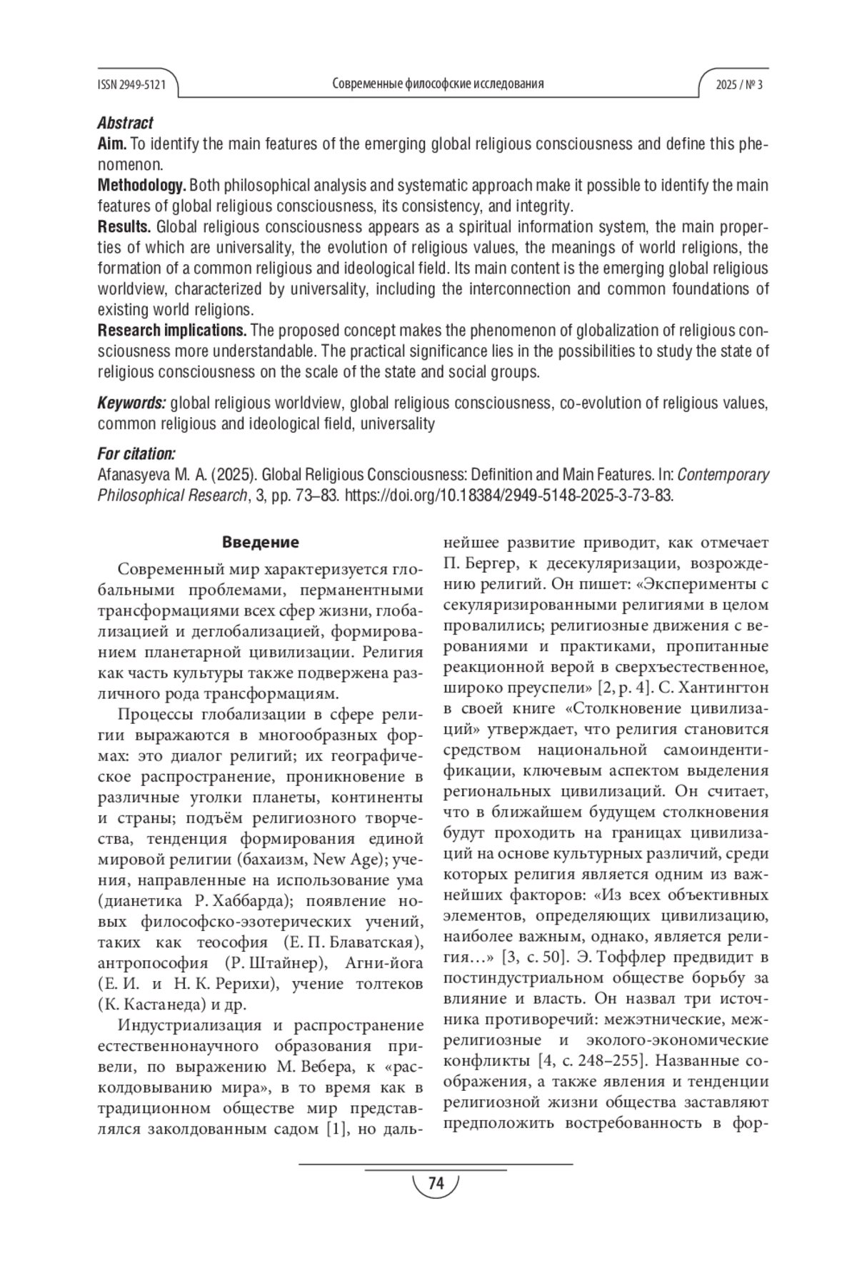 Цель. Выявить основные характеристики формирующегося глобального религиозного сознания и дать ему определение.